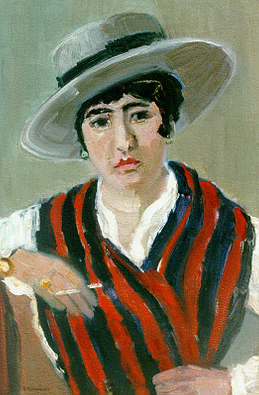 Berend Groeneveld kunstwerk • schilderij • voorheen te koop Dame met grijze hoed en sigaret