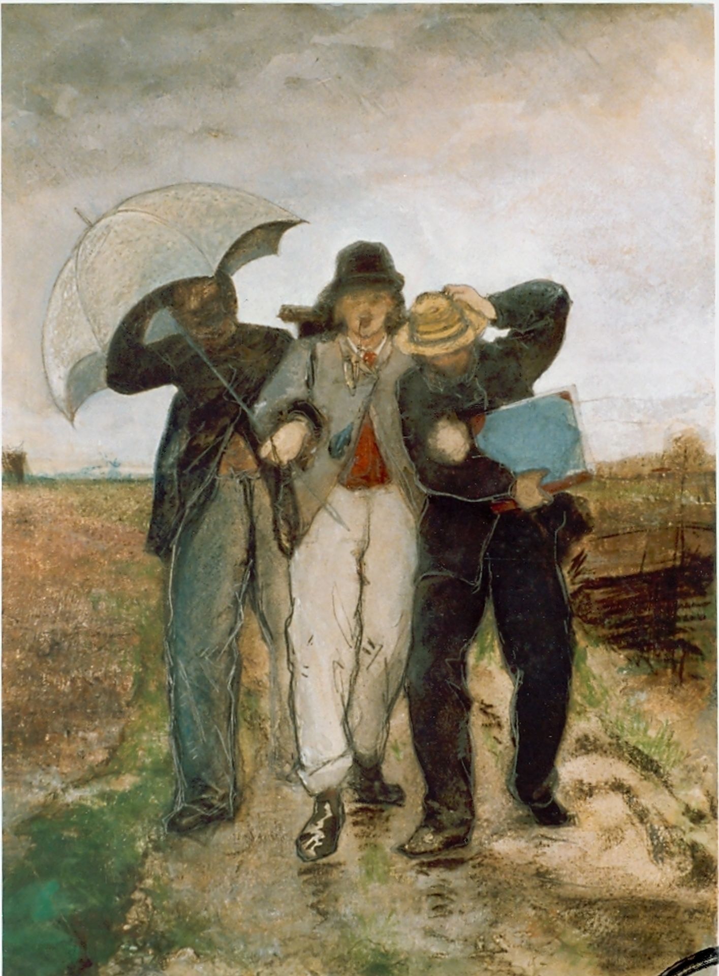 Bernard Blommers kunstwerk • aquarel • tekening • voorheen te koop Drie schilders in de regen