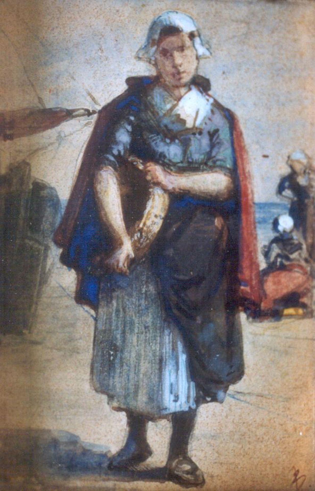 Bernard Blommers kunstwerk • aquarel • tekening • voorheen te koop Visverkoopster op het strand