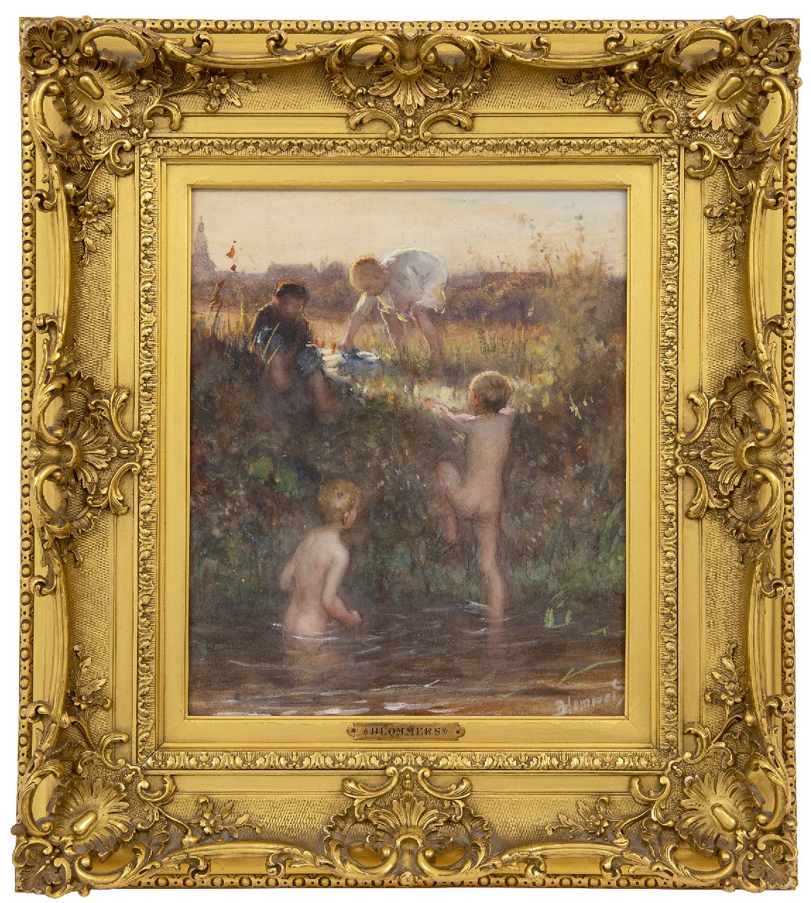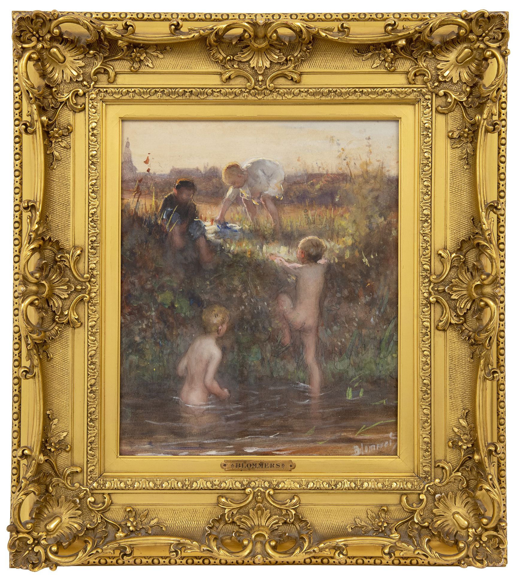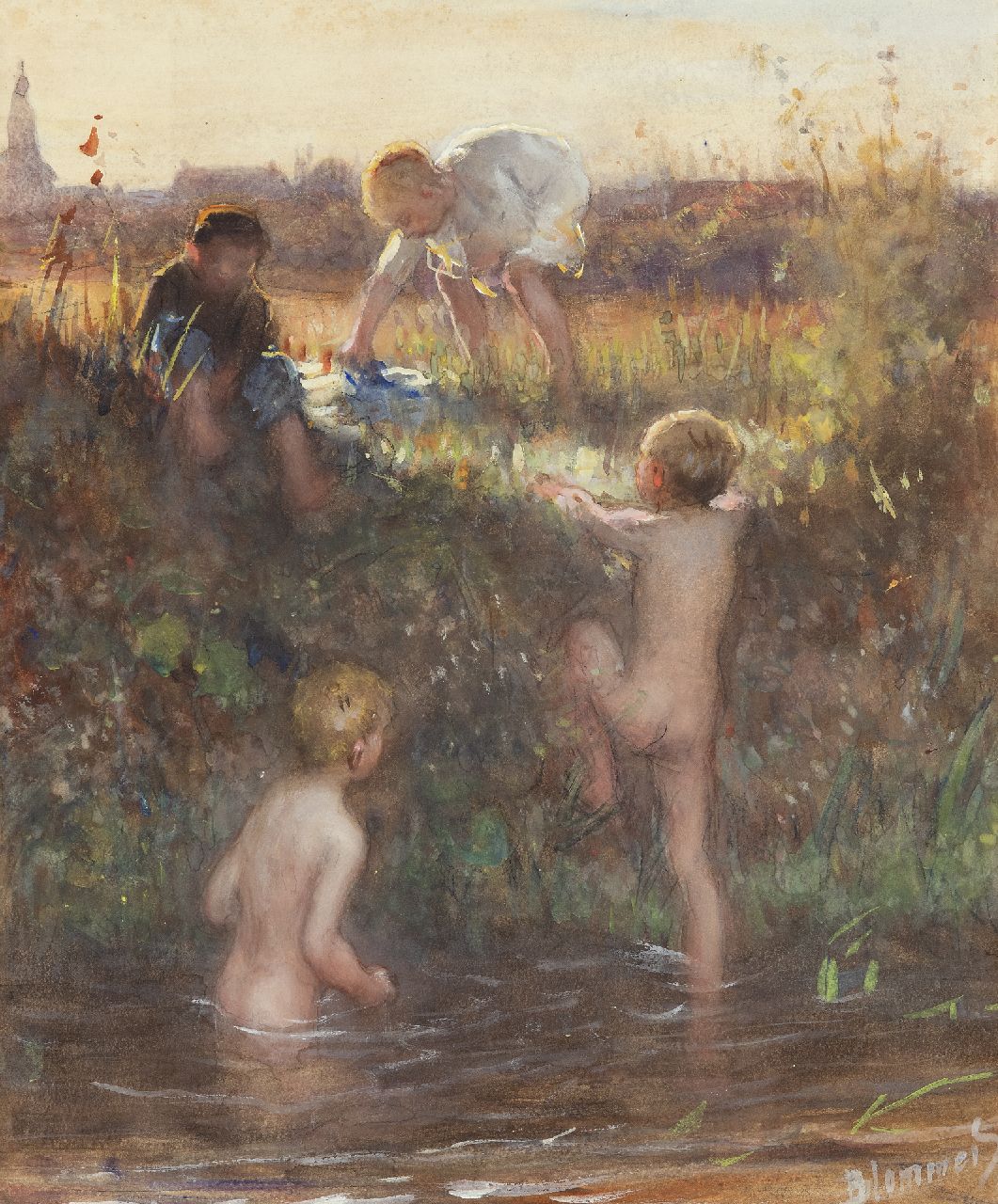 Bernard Blommers kunstwerk • aquarel • tekening • te koop Badende kinderen in Het Kanaal, Scheveningen