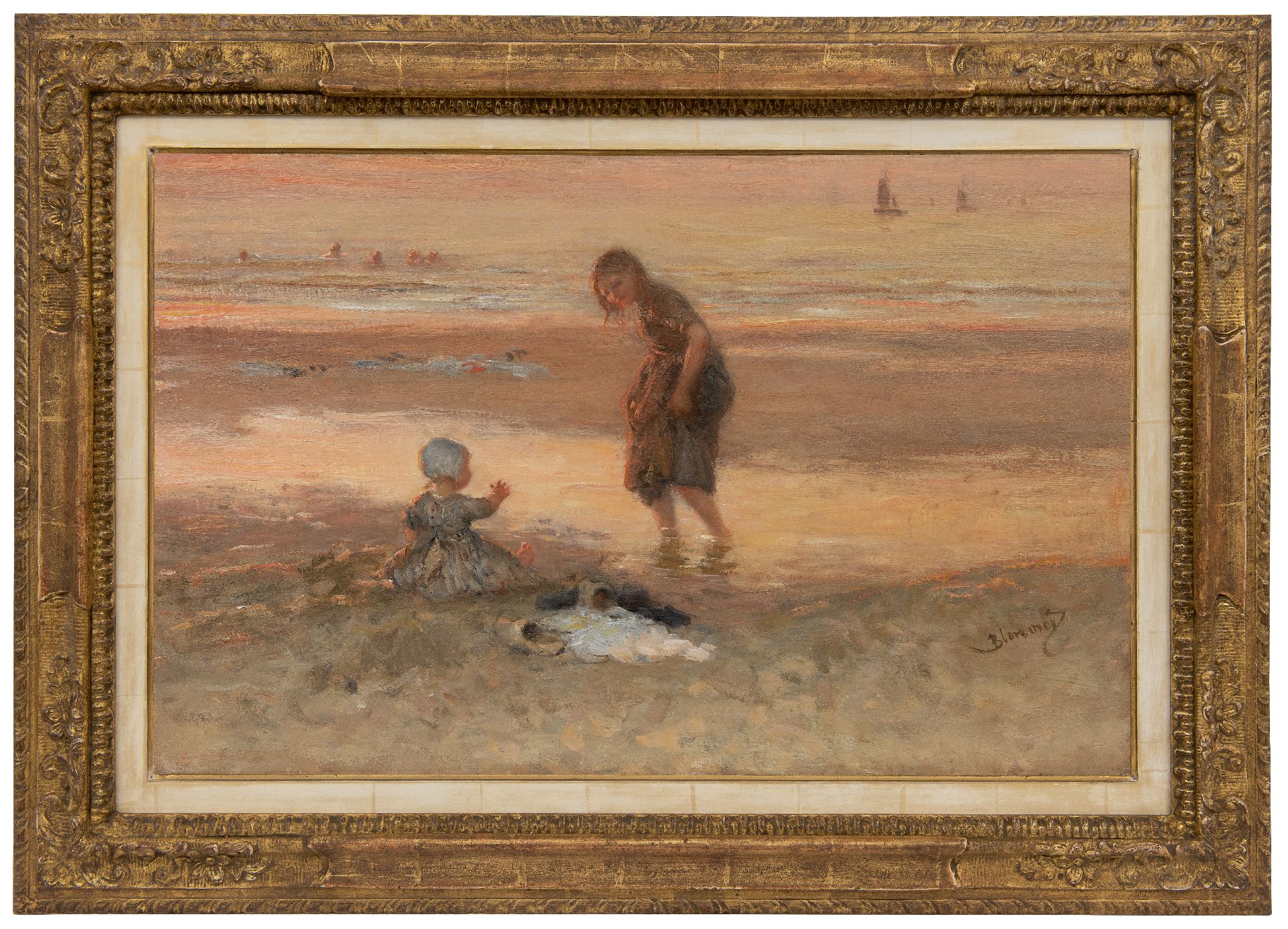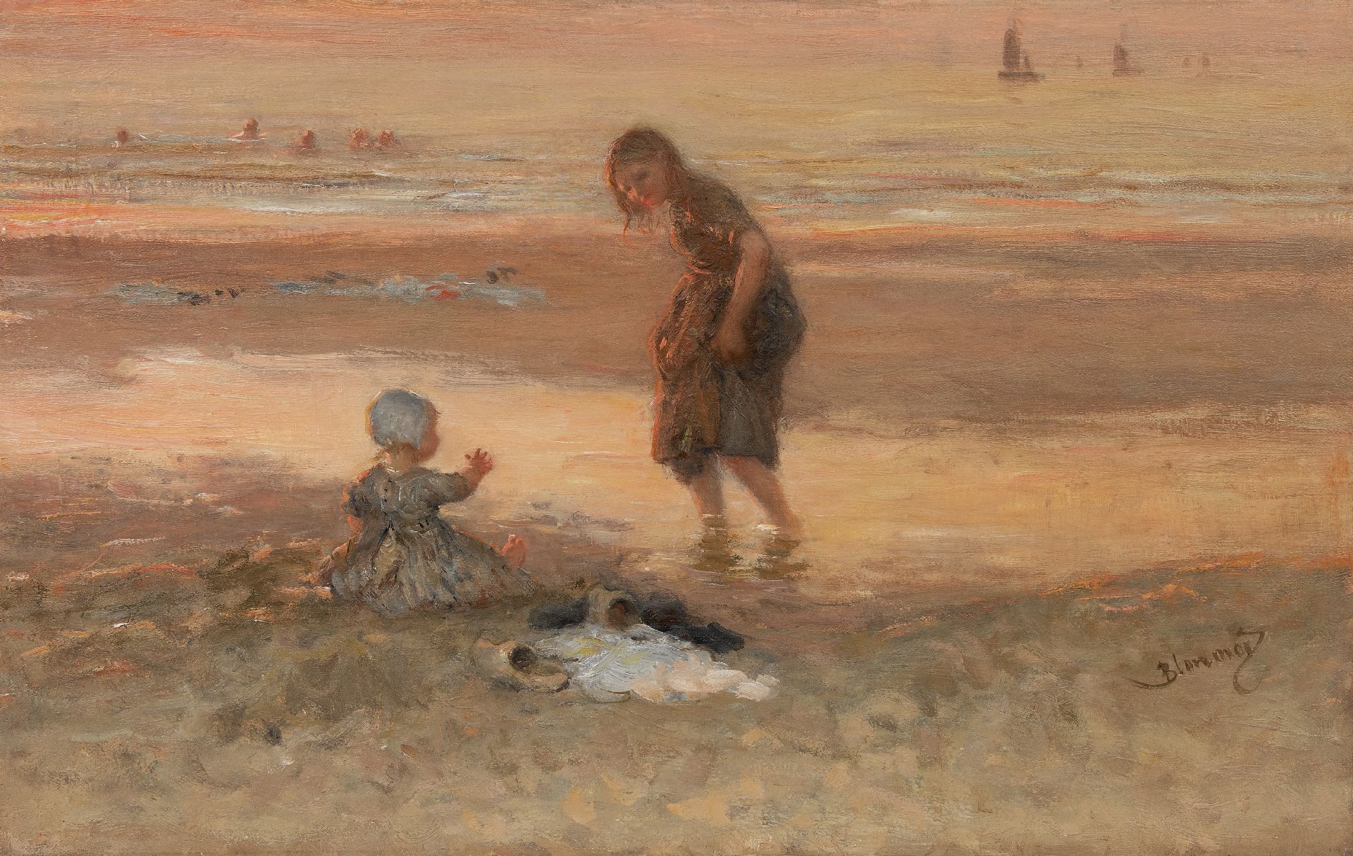 Blommers B.J.  | Bernardus Johannes 'Bernard' Blommers | Schilderijen te koop aangeboden | Kinderen op het strand bij eb, olieverf op doek 45,2 x 71,1 cm, gesigneerd rechtsonder