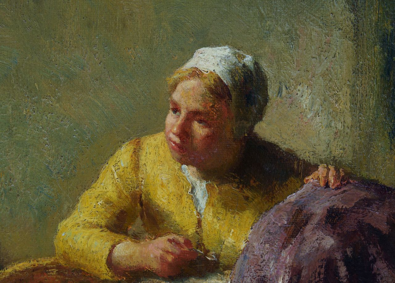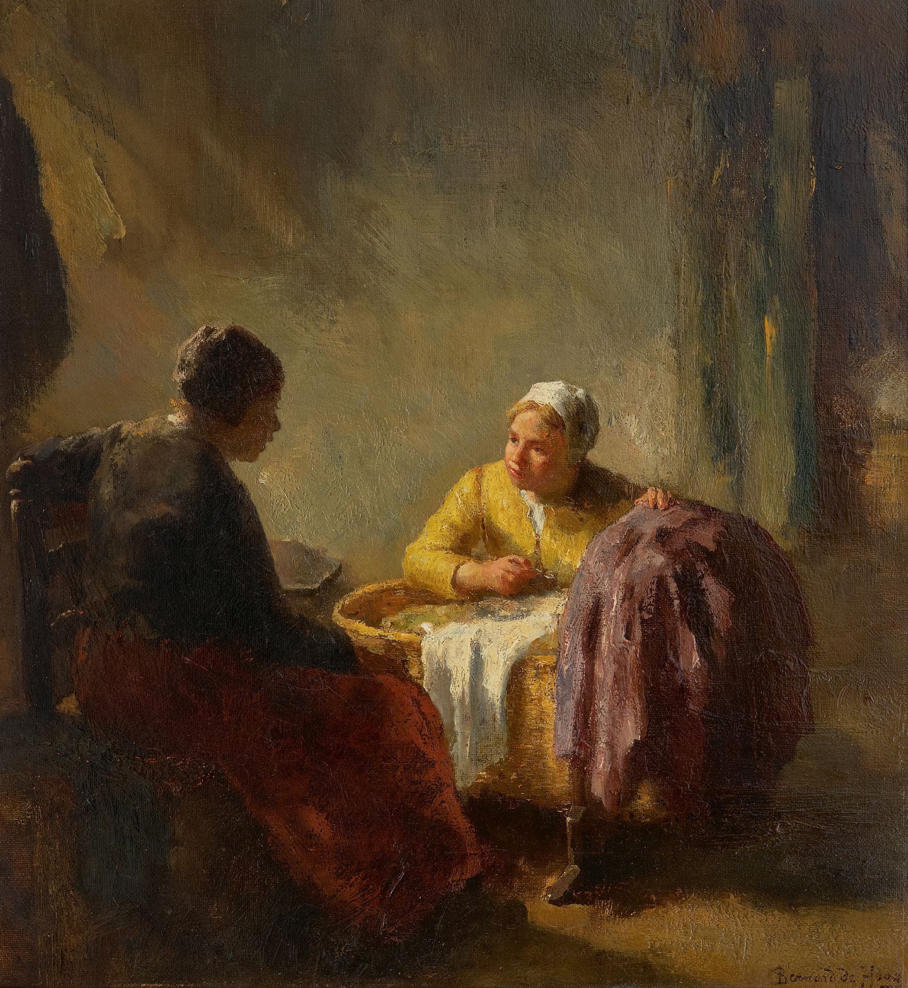Bernard de Hoog is vooral bekend geworden als schilder van stemmige Hollandse boereninterieurs, een genre dat vooral na 1880 in ons land zeer populair werd. Hij woonde en werkte in Amsterdam totdat hij in 1899 verhuisde naar Laren, waar hij kennis maakte met het werk van schilders als Albert Neuhuys, Hendrik Kever en Evert Pieters. In zijn interieurs legt De Hoog over het algemeen de nadruk op de figuren, meestal moeders en kinderen, die in het rustig voortgaan met hun dagelijkse bezigheden het toonbeeld zijn van een sereen, huiselijk geluk. Na 1924, toen hij in Den Haag woonde, schilderde De Hoog ook het vissersleven en zo nu en dan een landschap met vee. Veel van zijn werk werd gekocht door verzamelaars in Amerika, Canada en Engeland.