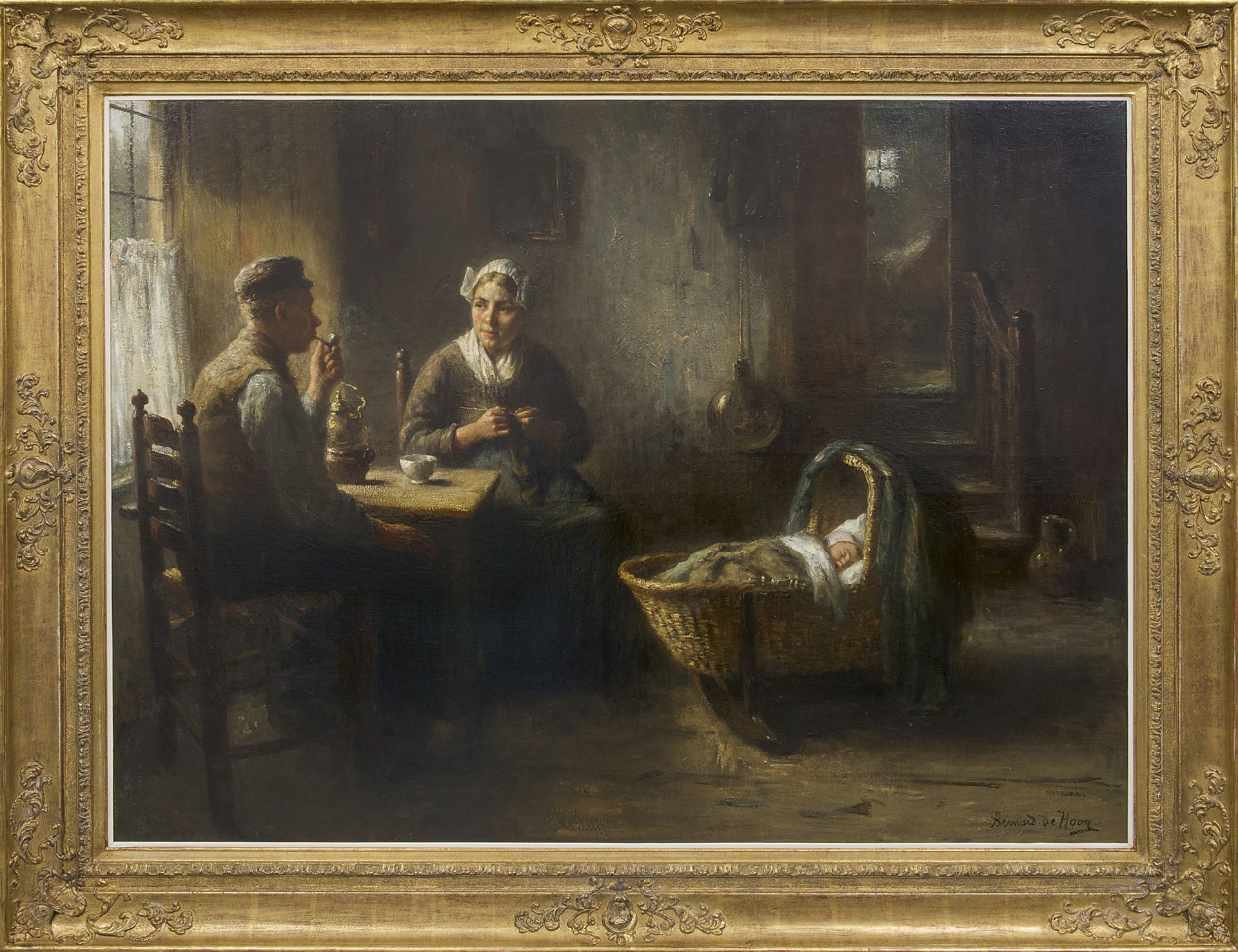 Bernard de Hoog is vooral bekend geworden als schilder van stemmige Hollandse boereninterieurs, een genre dat vooral na 1880 in ons land zeer populair werd. Hij woonde en werkte in Amsterdam totdat hij in 1899 verhuisde naar Laren, waar hij kennis maakte met het werk van schilders als Albert Neuhuys, Hendrik Kever en Evert Pieters. In zijn interieurs legt De Hoog over het algemeen de nadruk op de figuren, meestal moeders en kinderen, die in het rustig voortgaan met hun dagelijkse bezigheden het toonbeeld zijn van een sereen, huiselijk geluk. Na 1924, toen hij in Den Haag woonde, schilderde De Hoog ook het vissersleven en zo nu en dan een landschap met vee. Veel van zijn werk werd gekocht door verzamelaars in Amerika, Canada en Engeland.