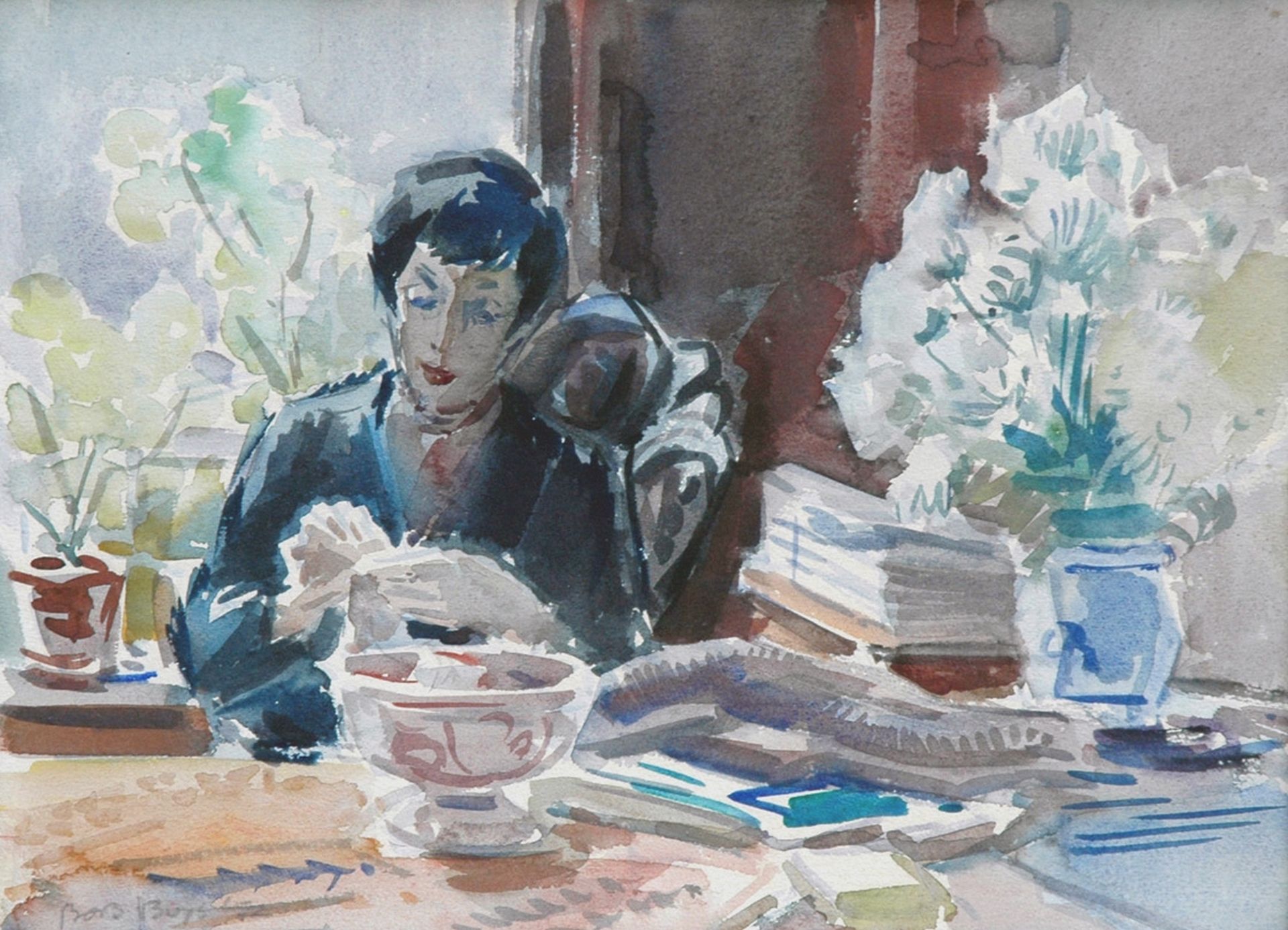 Bob Buijs kunstwerk • aquarel • tekening • voorheen te koop Interieur met de hoedenmaakster Mies Sanders