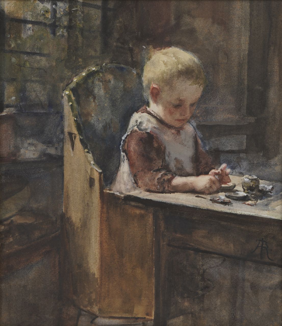 Hubrecht A.A.L.  | Abrahamina Arnolda Louise 'Bramine' Hubrecht | Aquarellen en tekeningen te koop aangeboden | In de kinderstoel, aquarel op papier op board 35,0 x 30,0 cm, gesigneerd rechtsonder met monogram