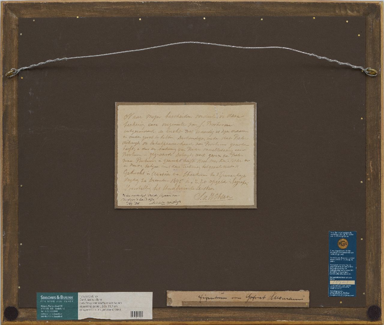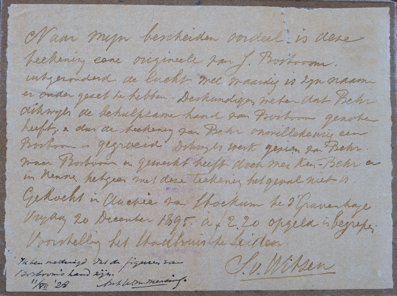 annotatie annotatie op achtertikkarton: 'Naar mijn bescheiden oordeel is deze teekening eene origineele van J. Bosboom, uitgezonderd de lucht, wel waardig is zijn naam eronder gezet te hebben. Deskundigen weten dat Behr dikwijls de behulpzame hand van Bosboom genoten heeft en dus de teekening van Behr onwillekeurig een Bosboom is gegroeid. Dikwijls werk gezien van Behr en in … hetgeen met deze teekening het geval niet is. Gekocht in auctie van Stockum te 's Gravenhage vrijdag 20 december 1895 a f 220 opgeld inbegrepen. Voorstelling het stadhuis te Leiden, S. v. Witzen.' en 'Ik ben overtuigd dat de figuren van Bosboom's hand zijn. 11/VII '28 Anton. W.M. Mensing'. Deze Mensing (1866-1936) was eigenaar van Frederik Muller & Co.