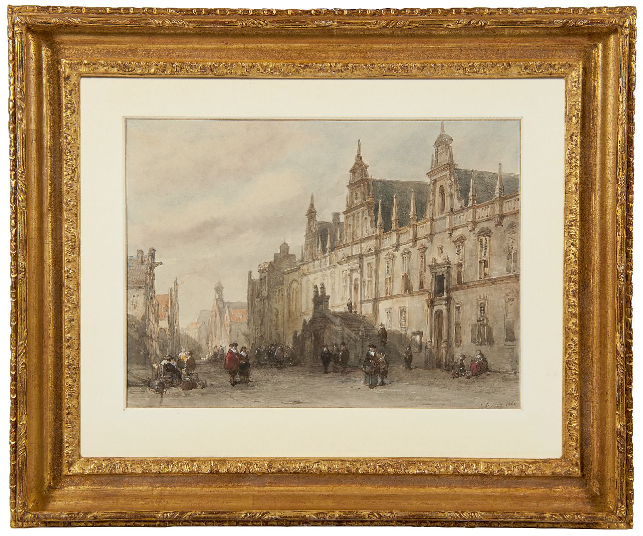 Carel Jacobus Behr kunstwerk • aquarel • tekening • voorheen te koop Gezicht op het stadhuis van Leiden