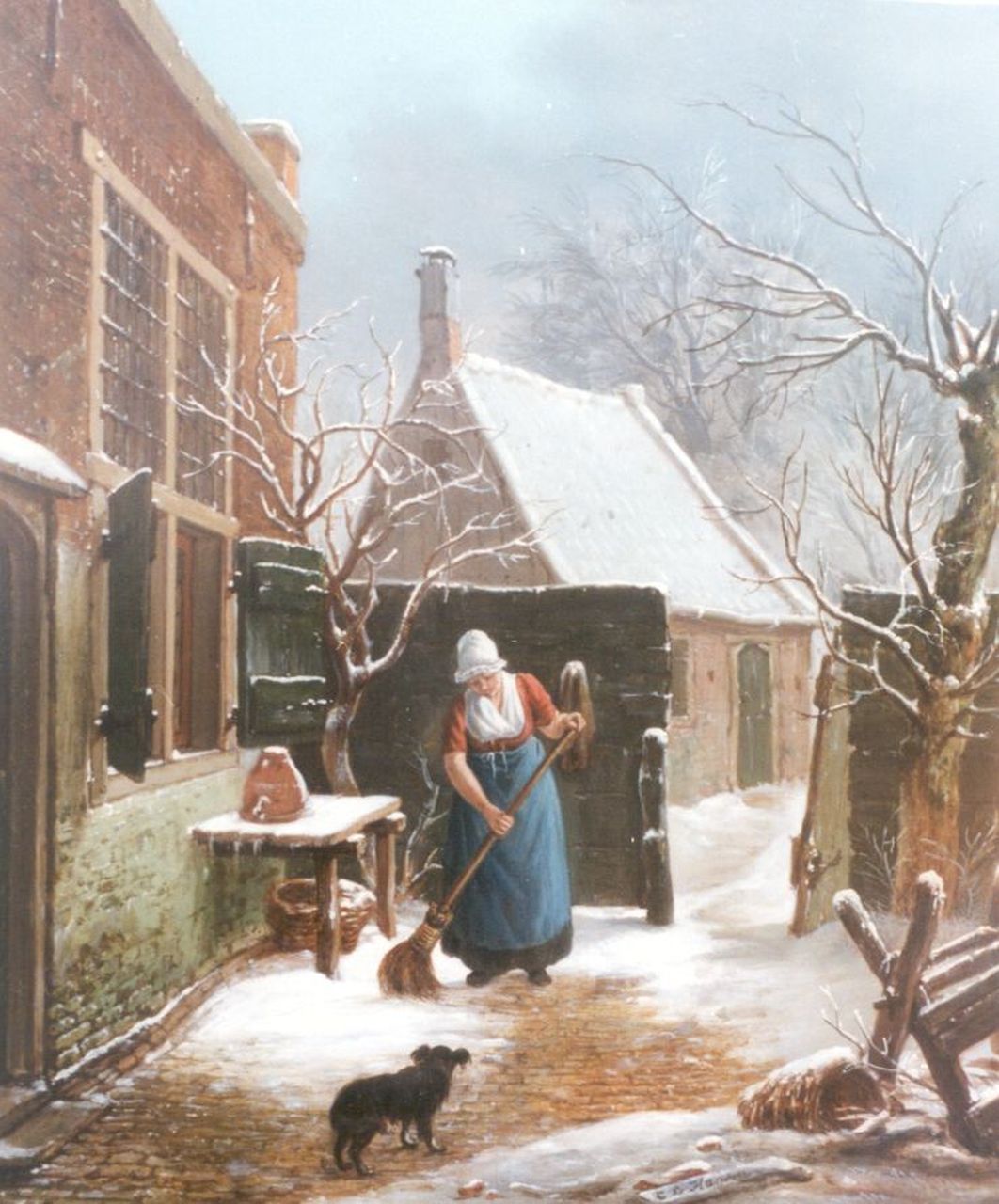 Carel Lodewijk Hansen kunstwerk • schilderij • voorheen te koop Het aanvegen van het besneeuwde erf