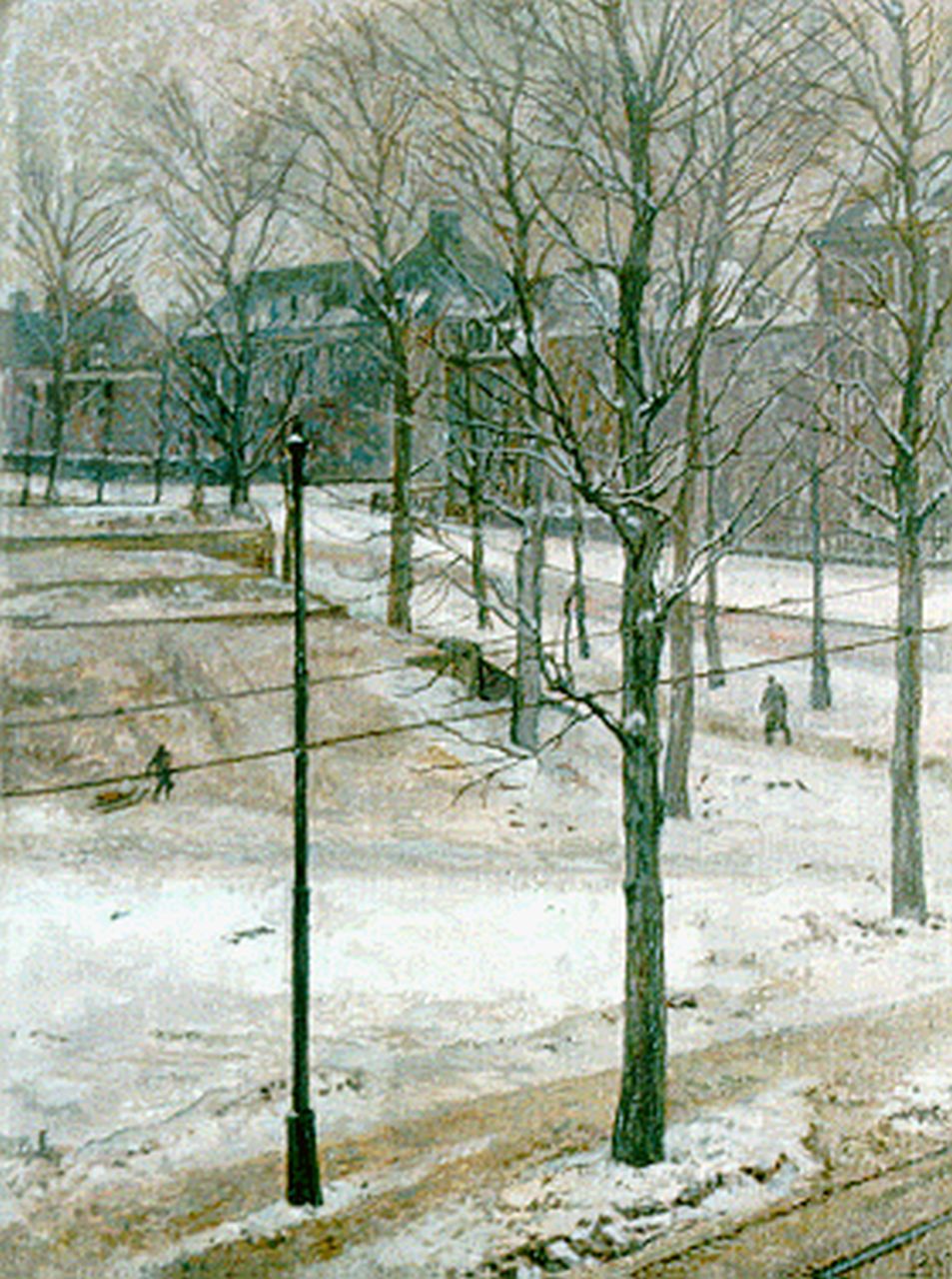 Carl Albert Feldmann kunstwerk • schilderij • voorheen te koop Winters stadsgezicht in Amsterdam