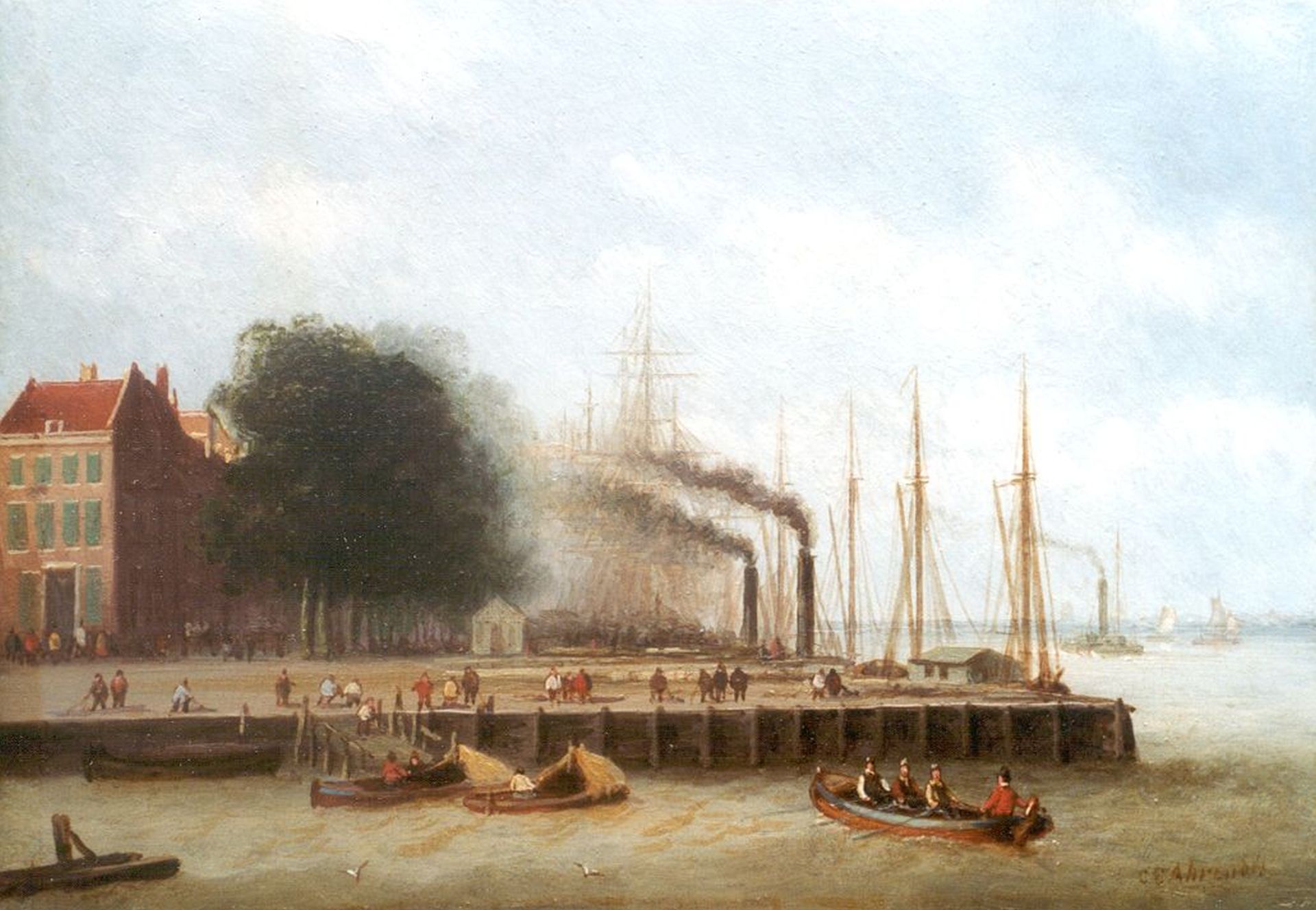 Carl Eduard Ahrendts kunstwerk • schilderij • voorheen te koop Gezicht op de Boompjes in Rotterdam