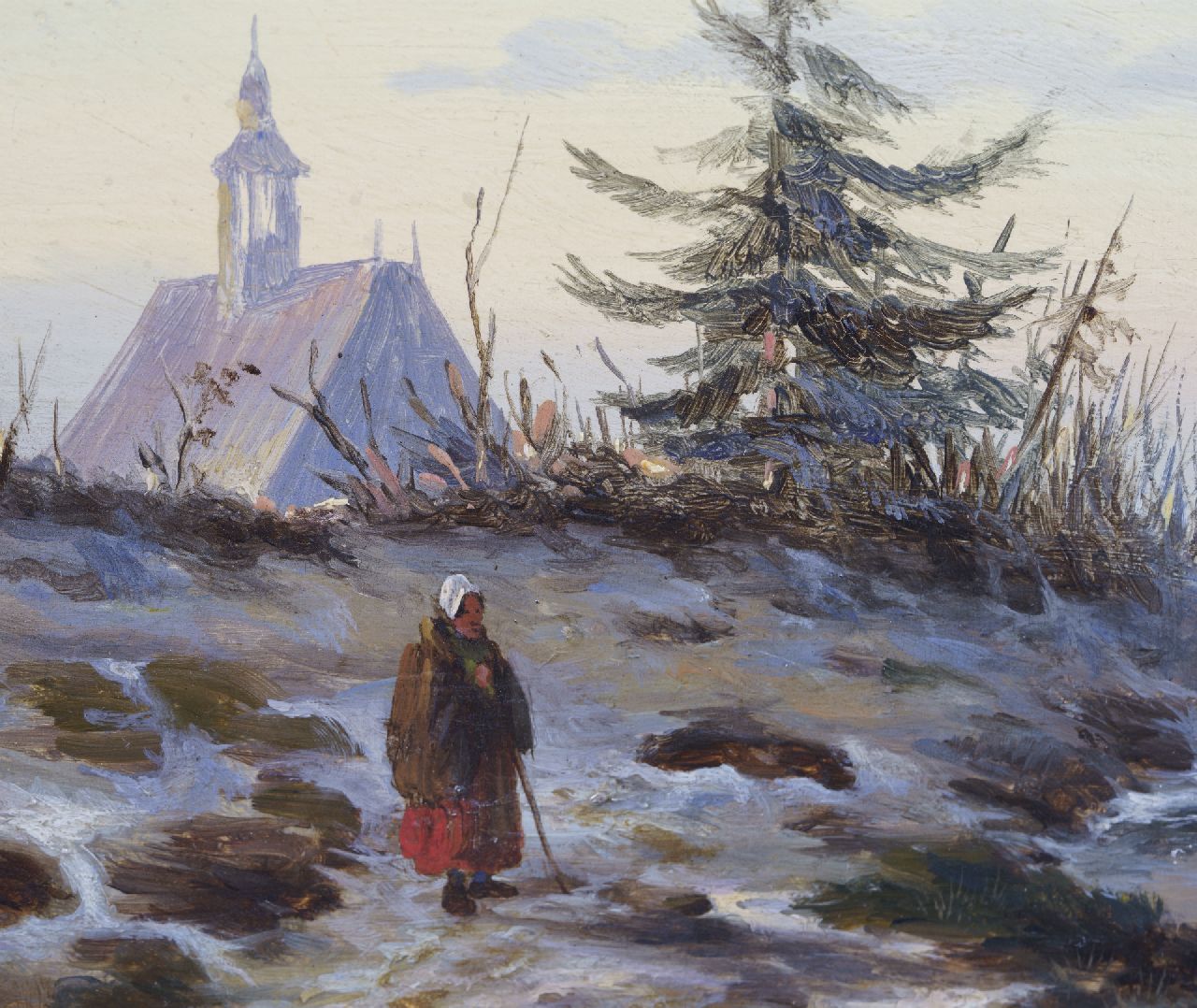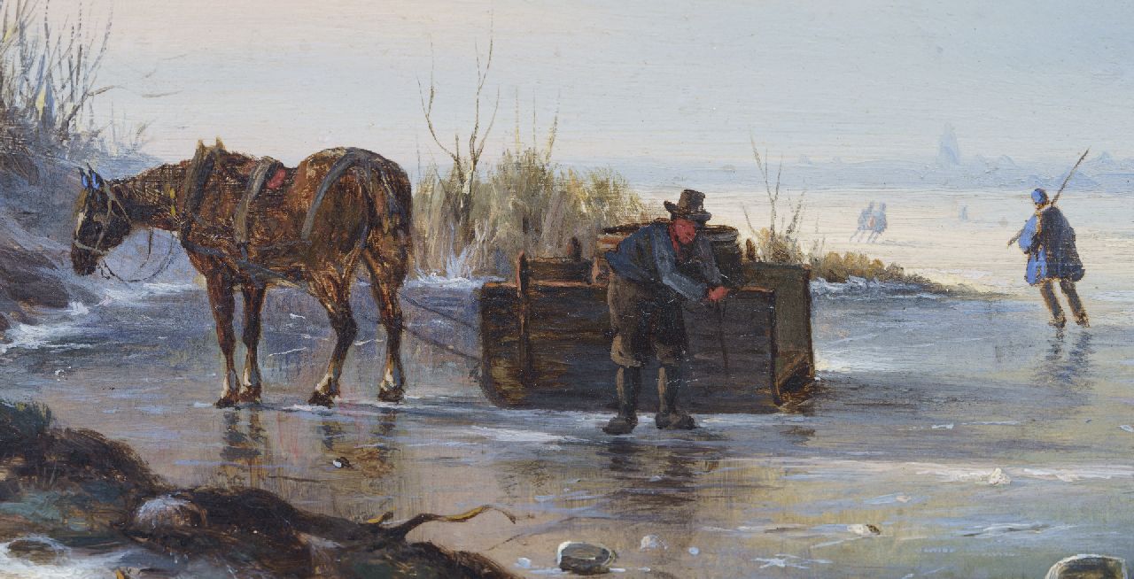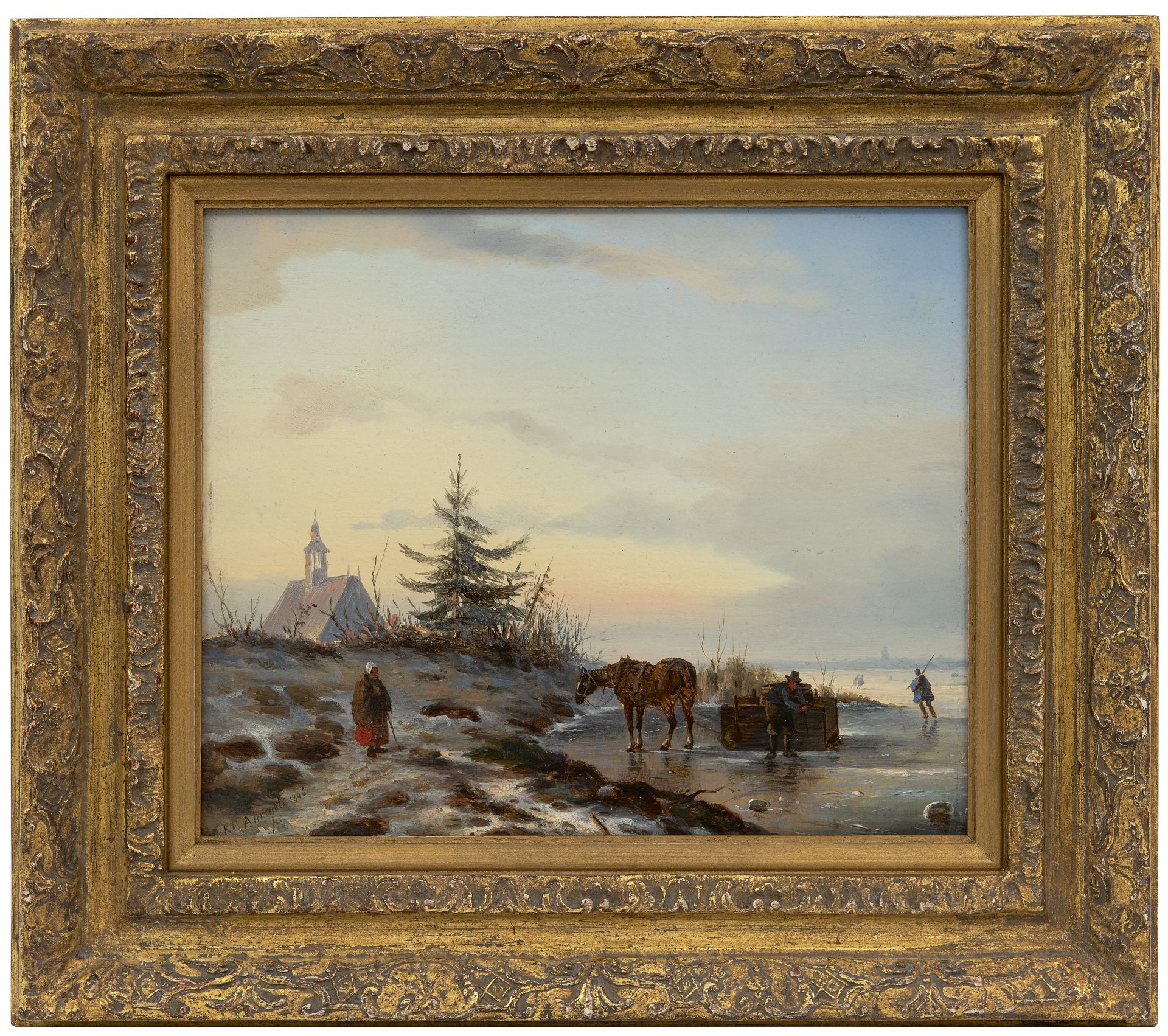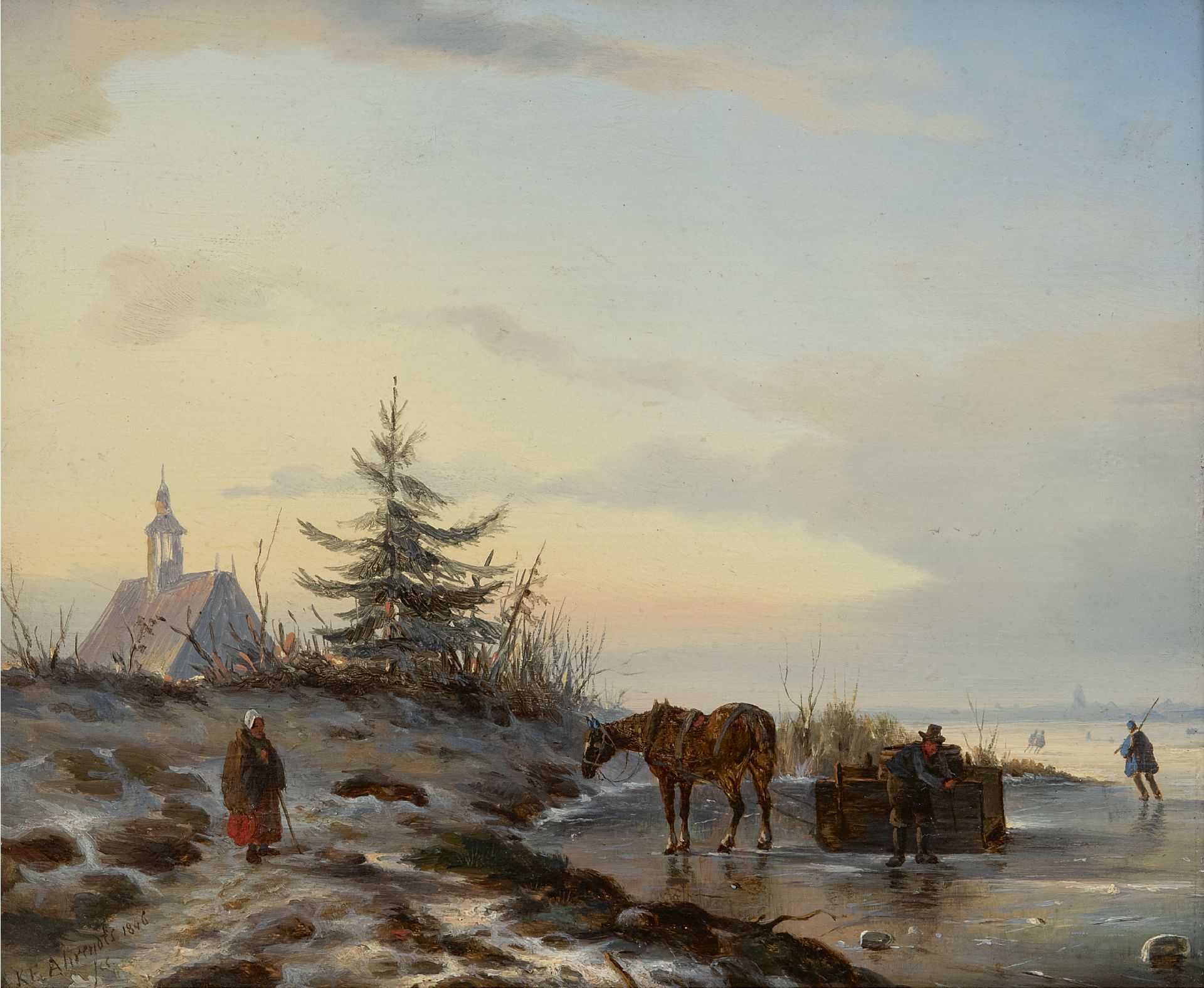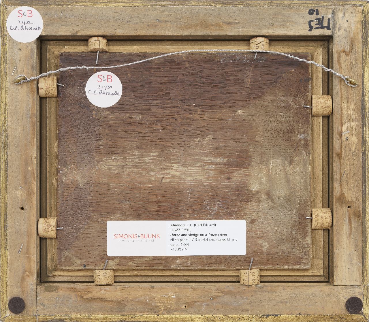 Carl Eduard Ahrendts kunstwerk • schilderij • voorheen te koop Paard en slee op het ijs
