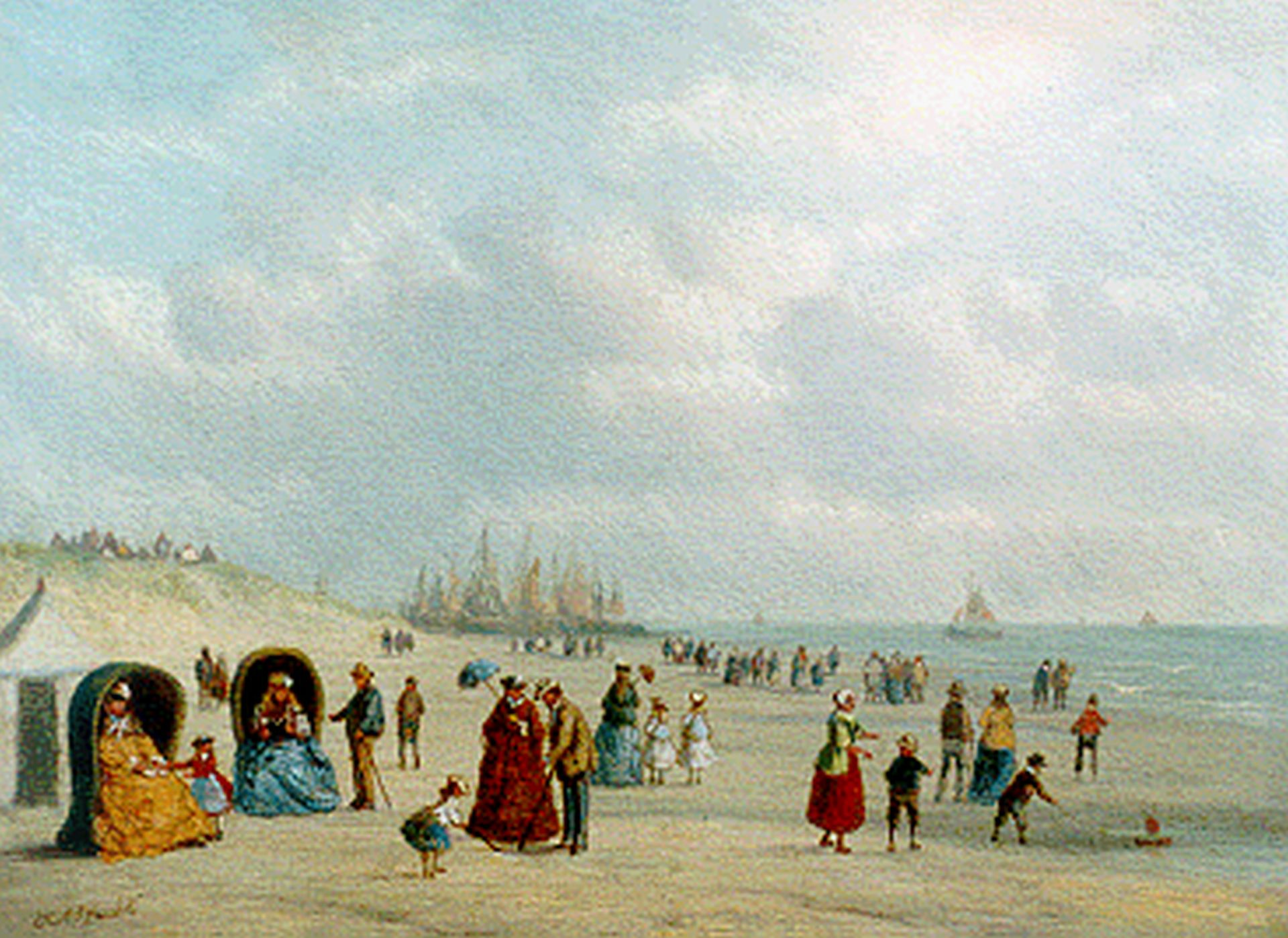 Carl Eduard Ahrendts kunstwerk • schilderij • voorheen te koop Vissersvolk en badgasten op het strand