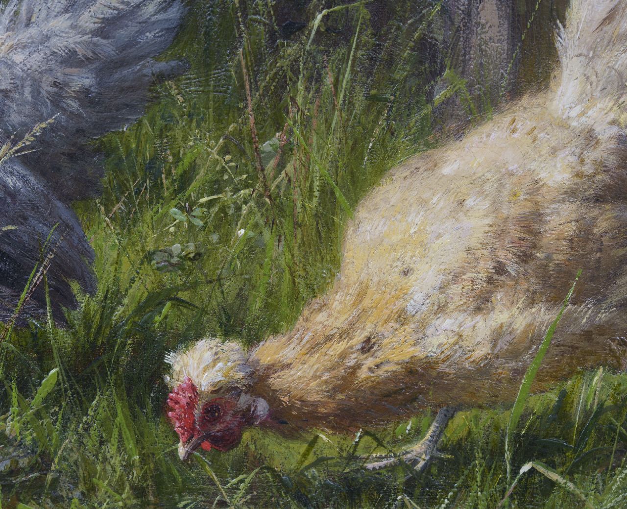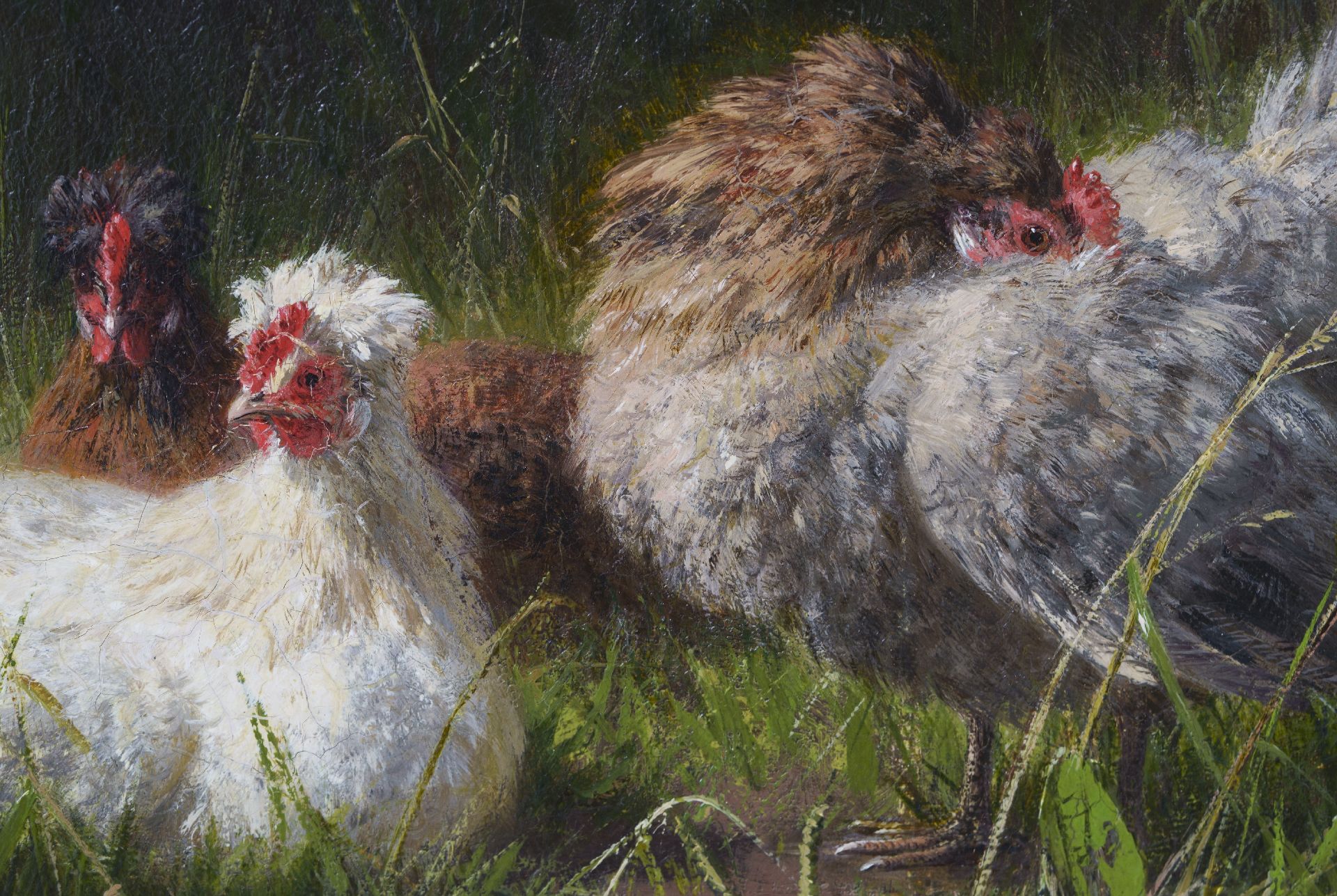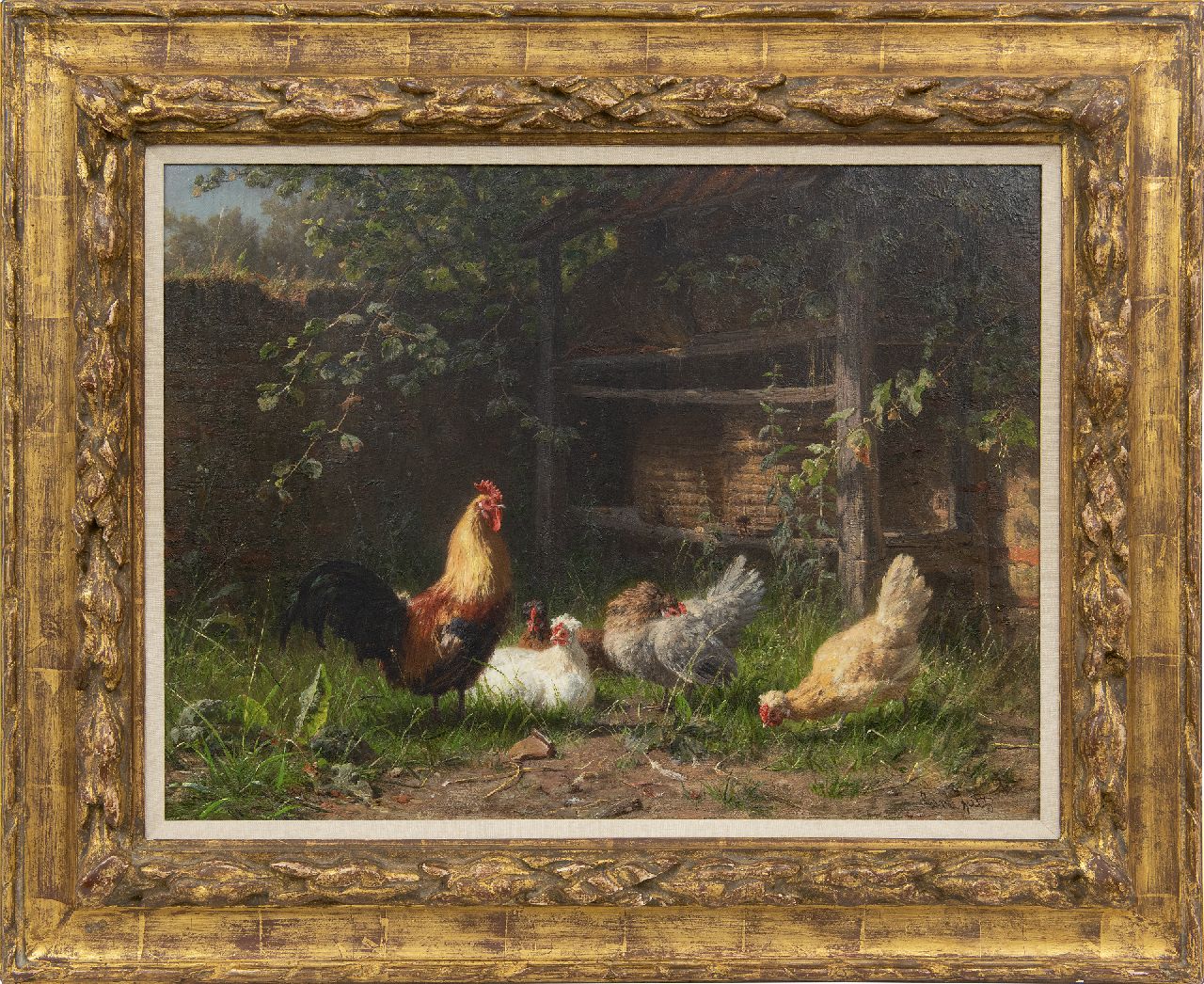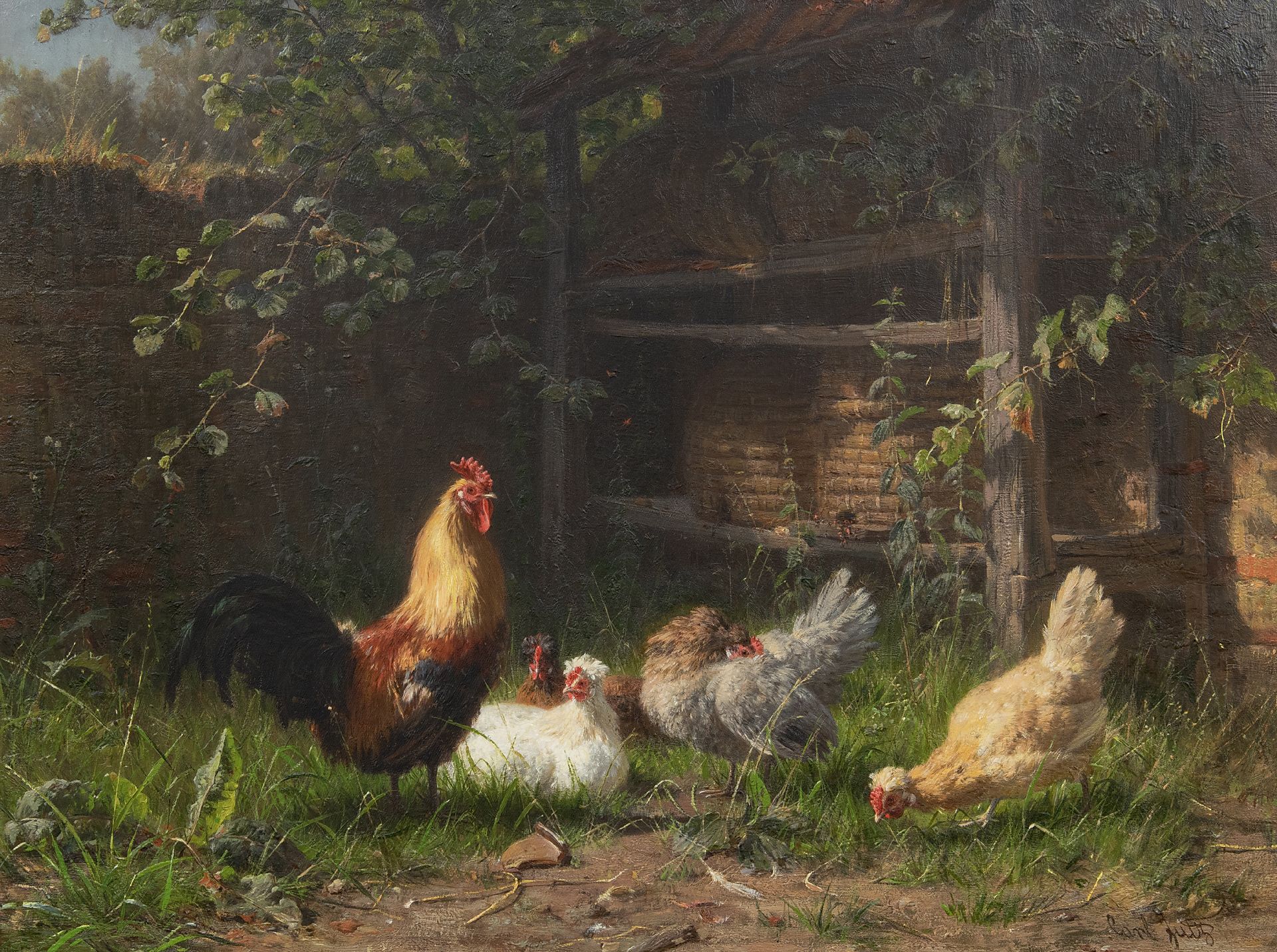 Carl Jutz kunstwerk • schilderij • voorheen te koop Haan en kippen bij bijenkorven