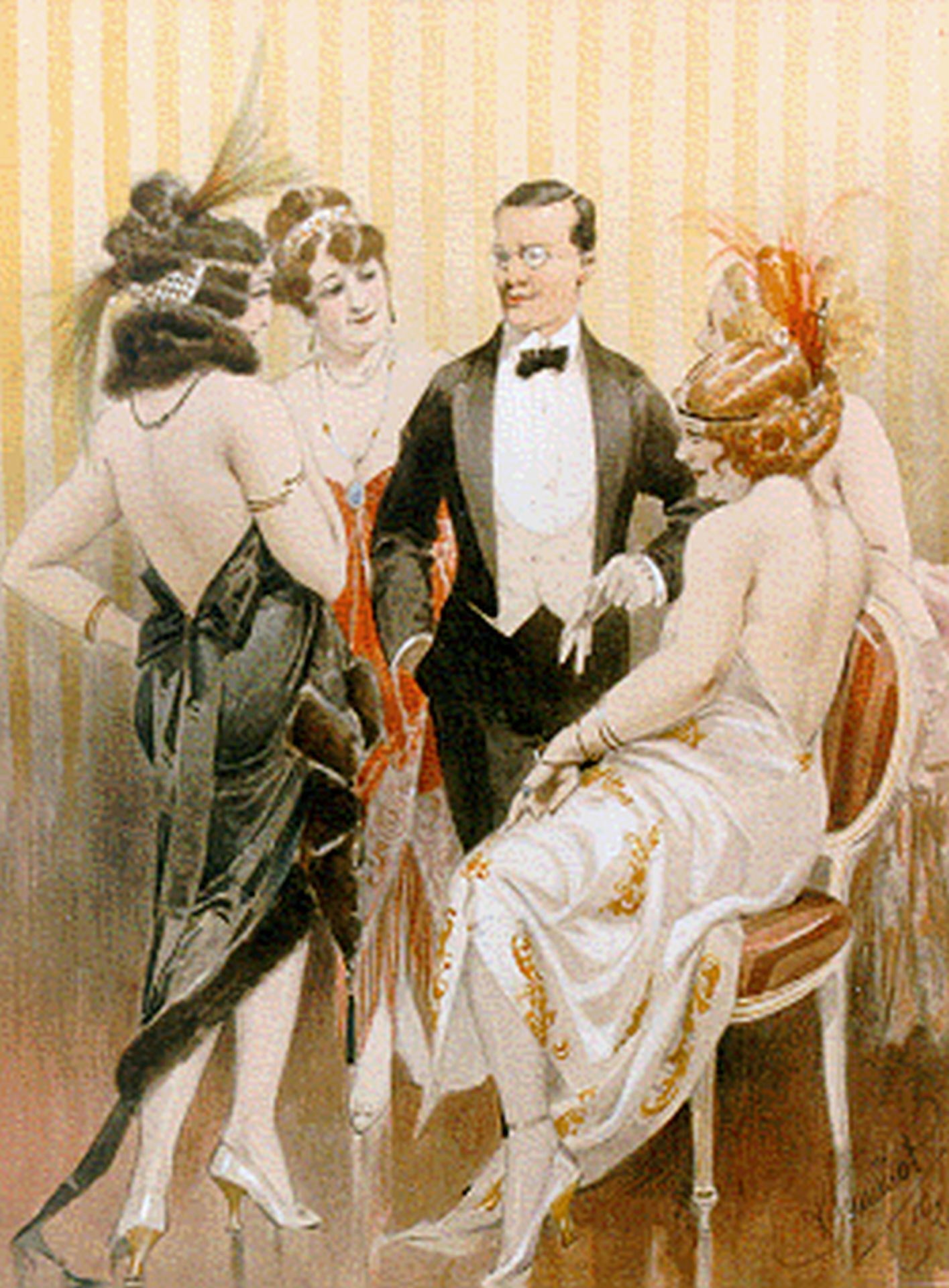 Simunek C.  | Carl Simunek, Le raconteur, aquarel op papier 32,0 x 24,5 cm, gesigneerd rechtsonder en gedateerd 1921