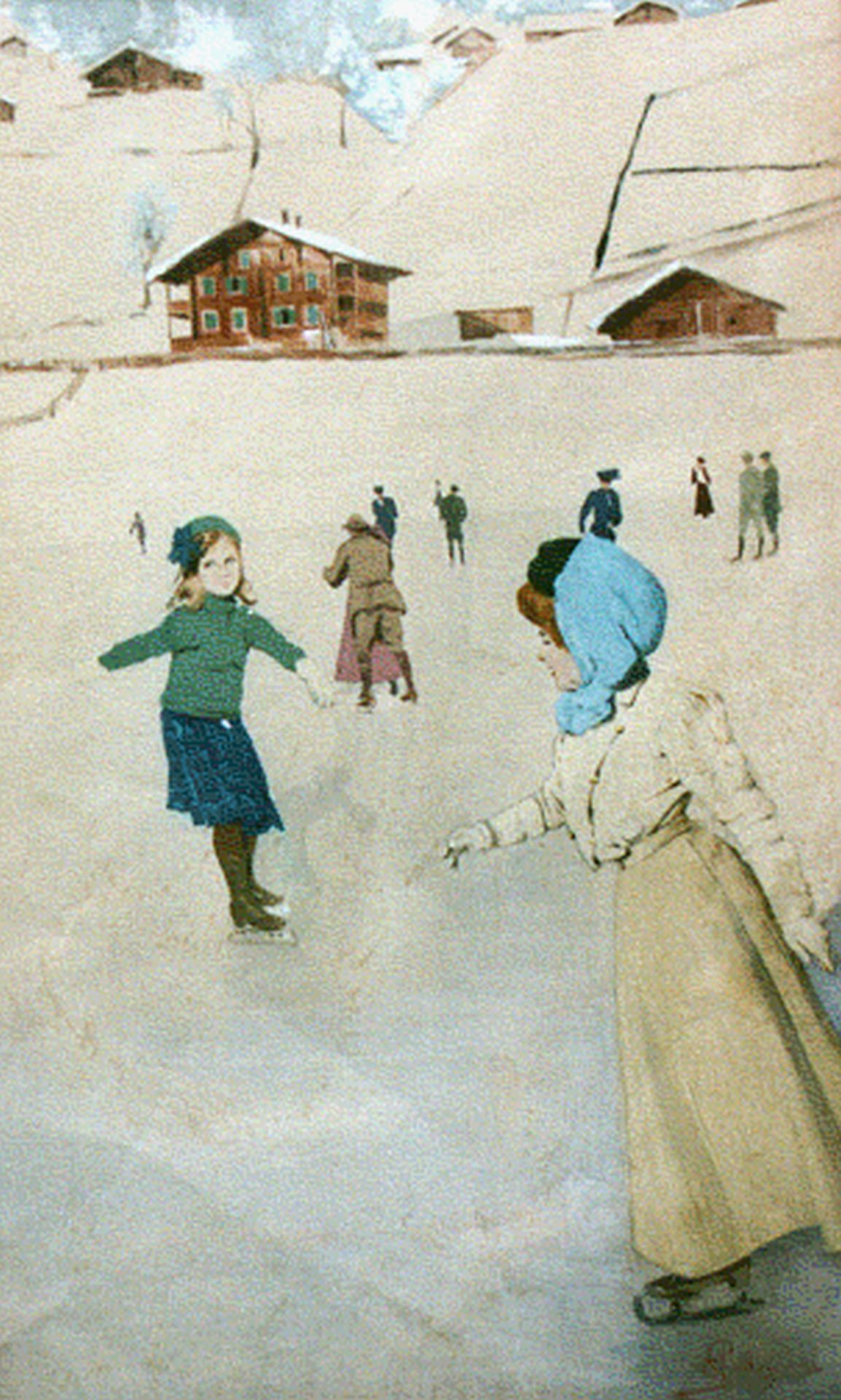 Carlo Pellegrini kunstwerk • aquarel • tekening • voorheen te koop Schaatsers op een Zwitsers meer