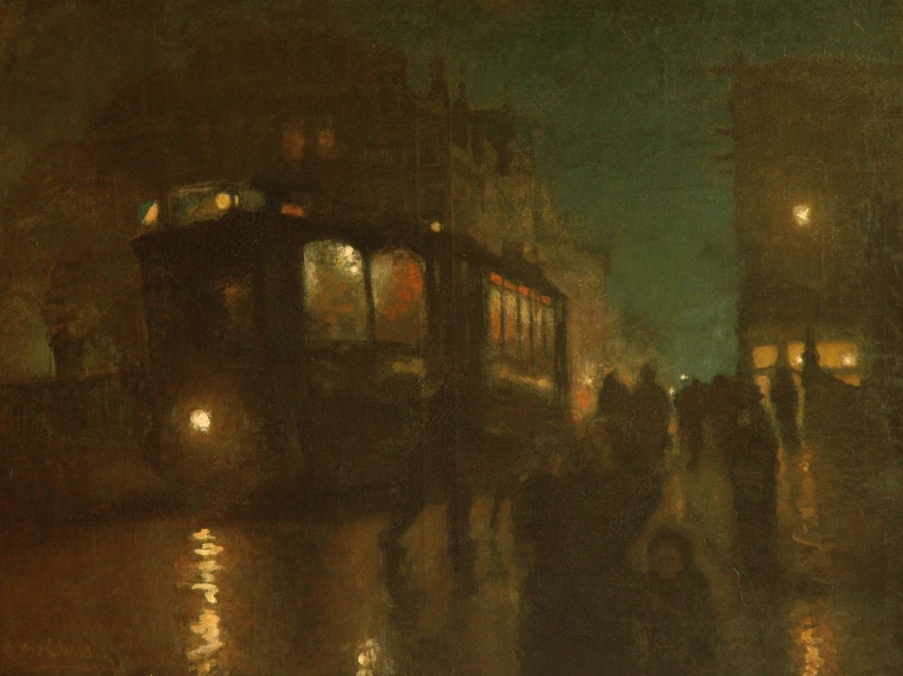 Cees Bolding kunstwerk • schilderij • voorheen te koop Leidsestraat bij avond, Amsterdam