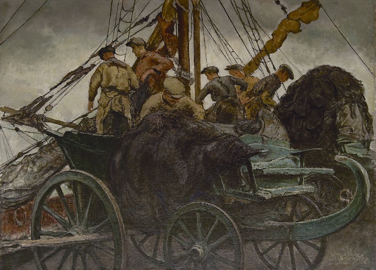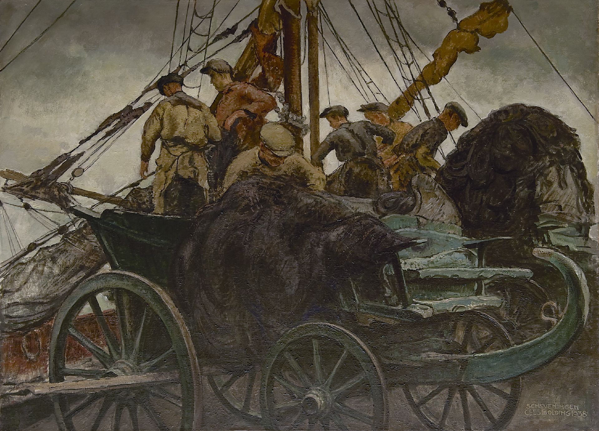 annotatie rechtsonder: 'Scheveningen' en op etiket op spieraam: 'Nettenladen haven van Scheveningen'