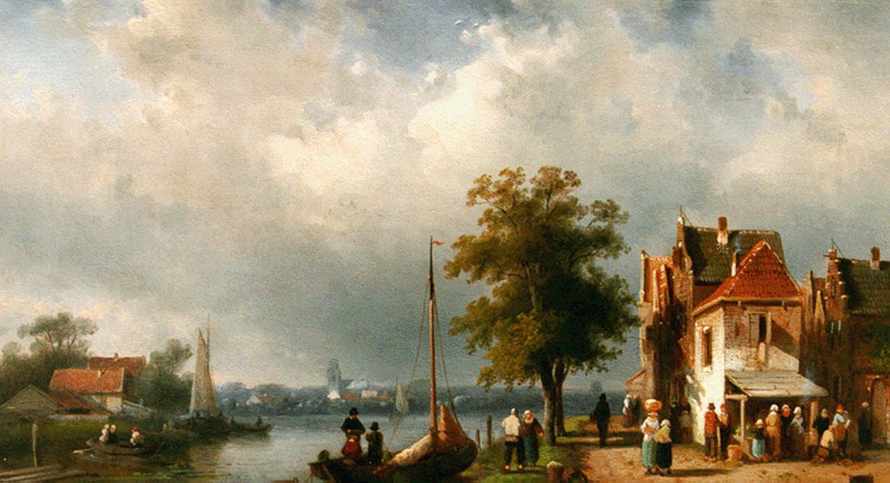 Charles Leickert kunstwerk • schilderij • voorheen te koop Bedrijvigheid langs de rivieroever