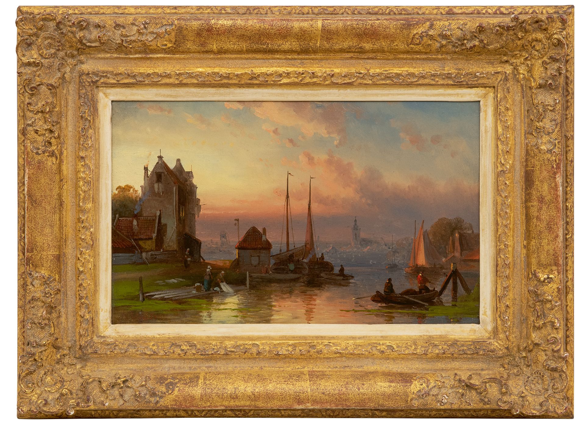 Charles Leickert kunstwerk • schilderij • te koop Bedrijvigheid op de rivier bij zonsondergang