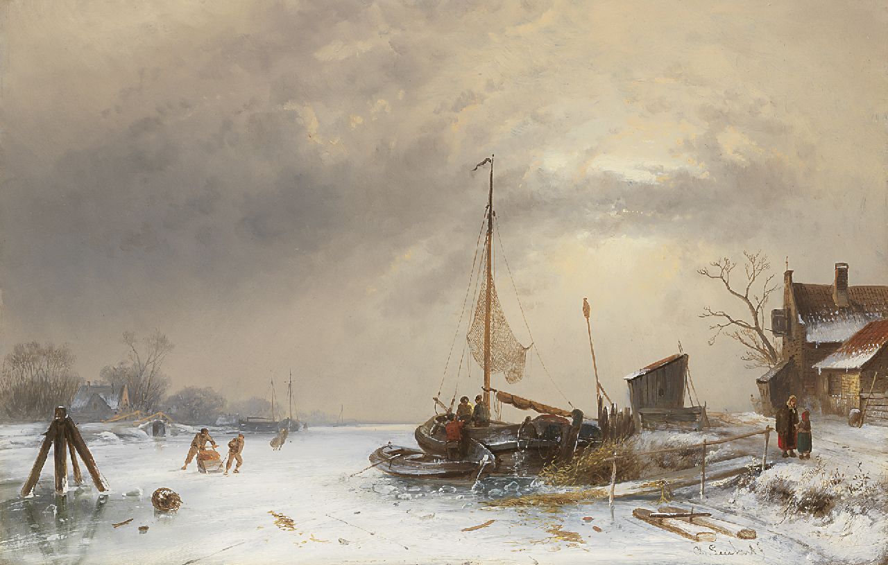Charles Leickert kunstwerk • schilderij • voorheen te koop Bevroren rivier met schaatsers en ingevroren schuit