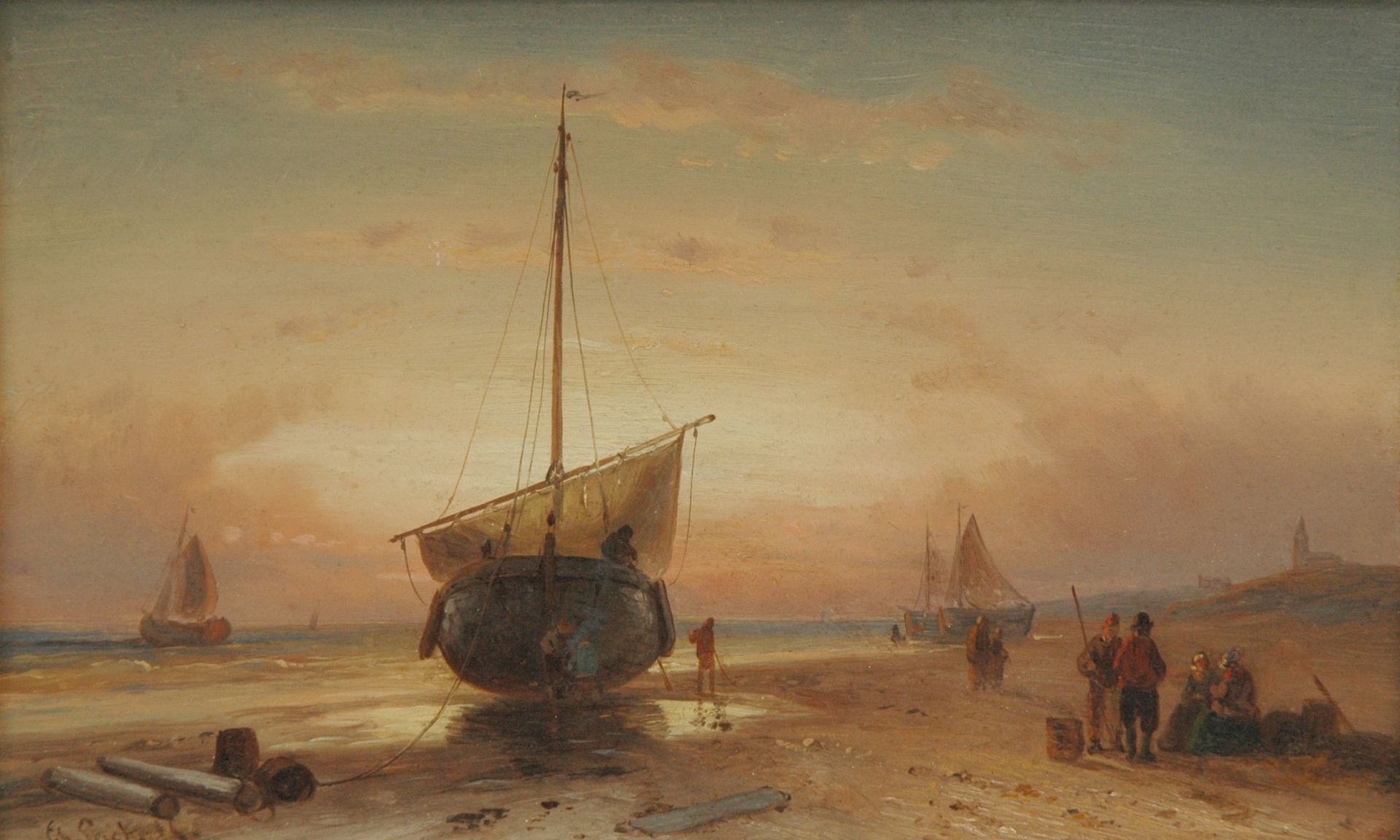 Charles Leickert kunstwerk • schilderij • voorheen te koop Bomschuit op het strand bij zonsondergang