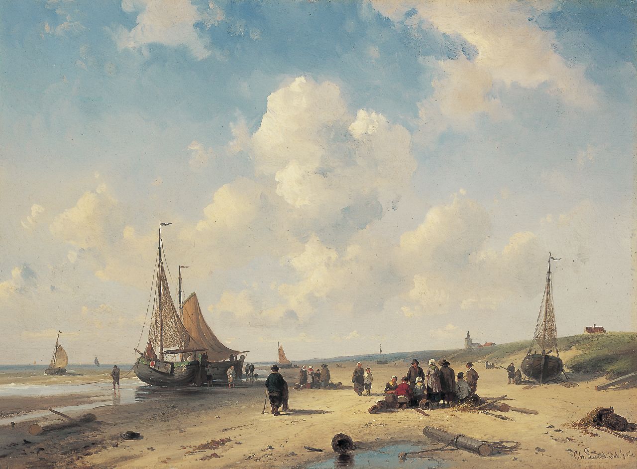 Charles Leickert kunstwerk • schilderij • voorheen te koop Bomschuiten en vissers bij eb op het strand van Scheveningen
