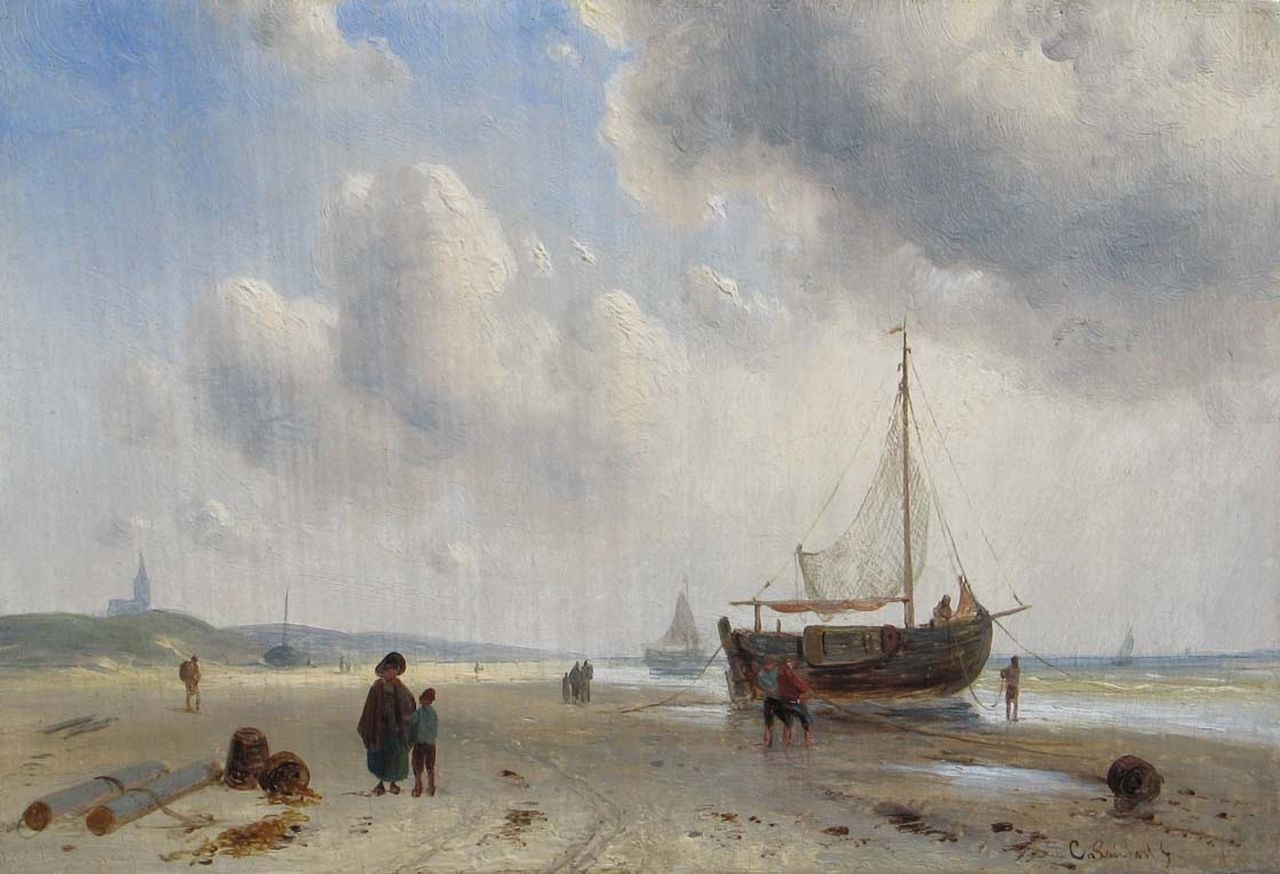 Charles Leickert kunstwerk • schilderij • voorheen te koop Bomschuiten en vissers op het strand van Scheveningen