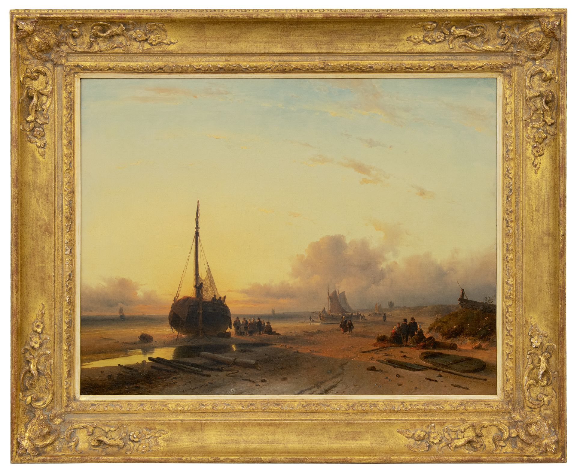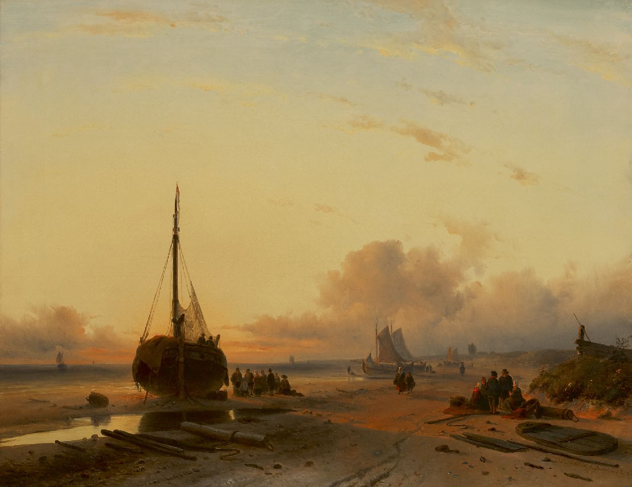 Charles Leickert kunstwerk • schilderij • te koop Bomschuiten op het strand bij ondergaande zon