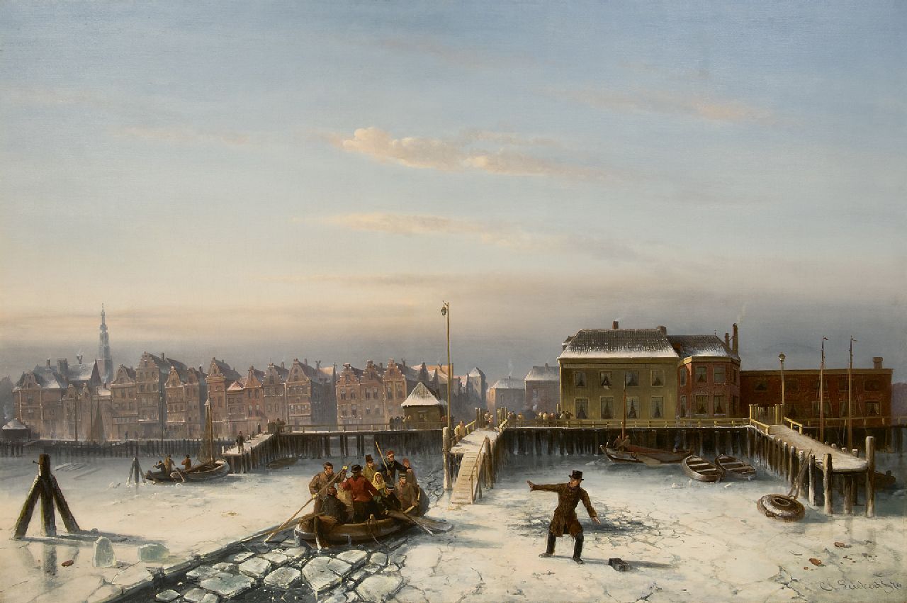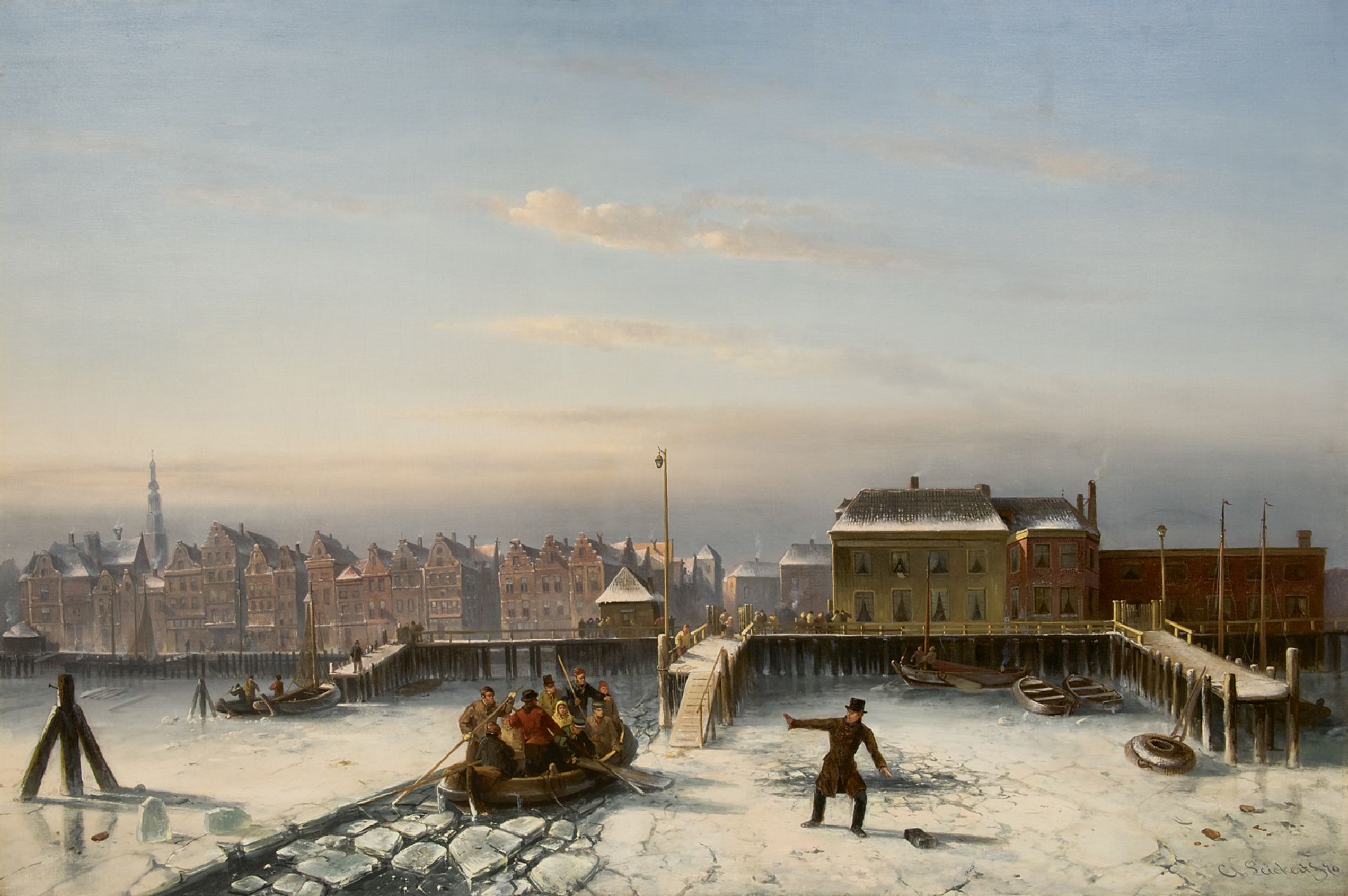 Charles Leickert kunstwerk • schilderij • voorheen te koop De hachelijke oversteek over het IJ bij Amsterdam
