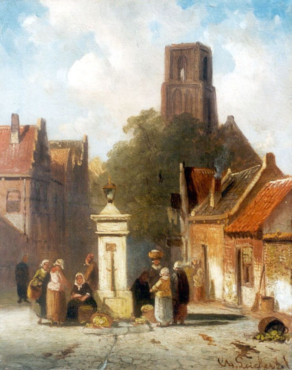 Charles Leickert kunstwerk • schilderij • voorheen te koop Dorpspleintje met groenteverkoopsters