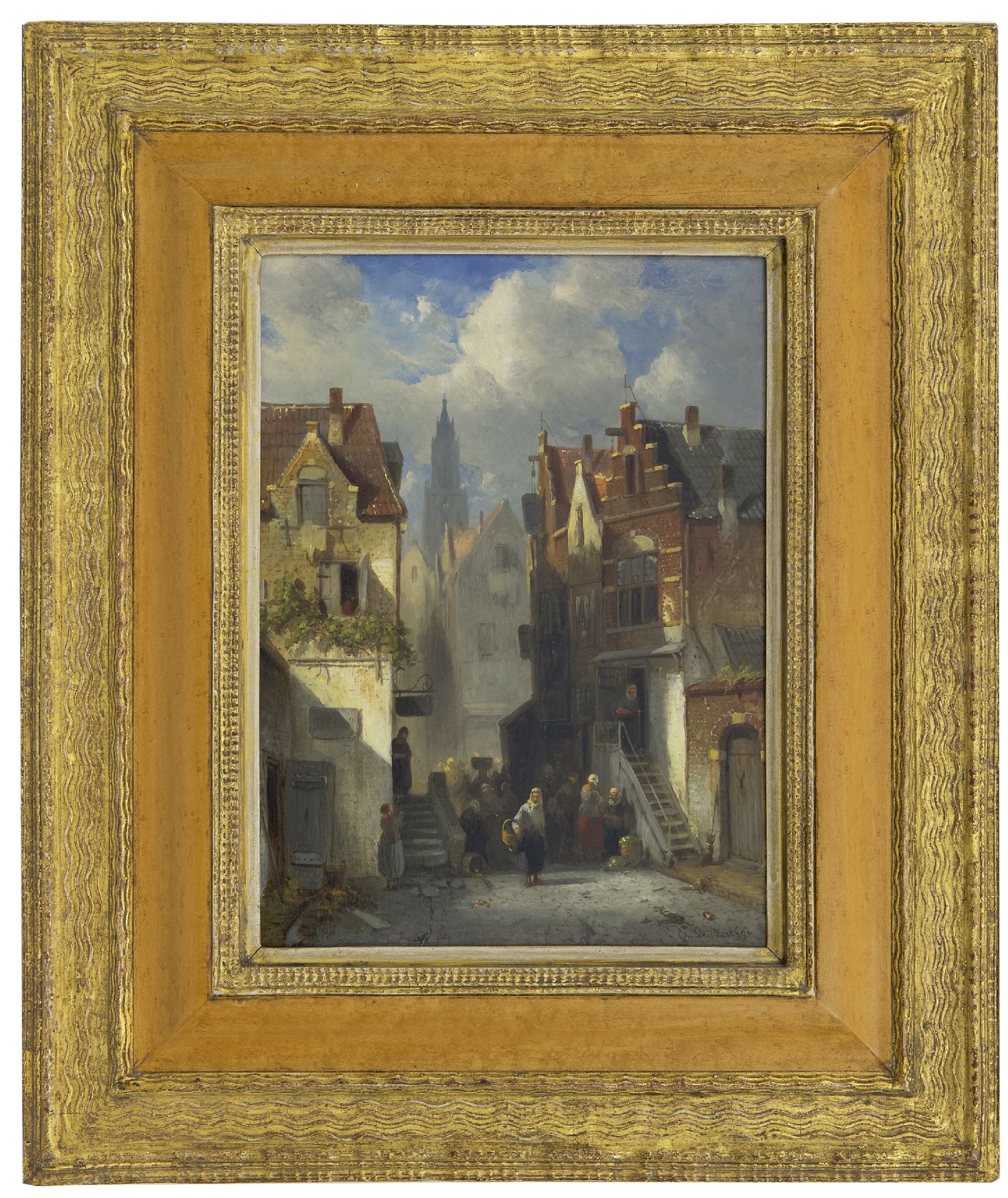 Charles Leickert kunstwerk • schilderij • voorheen te koop Drukbevolkt Hollands straatje