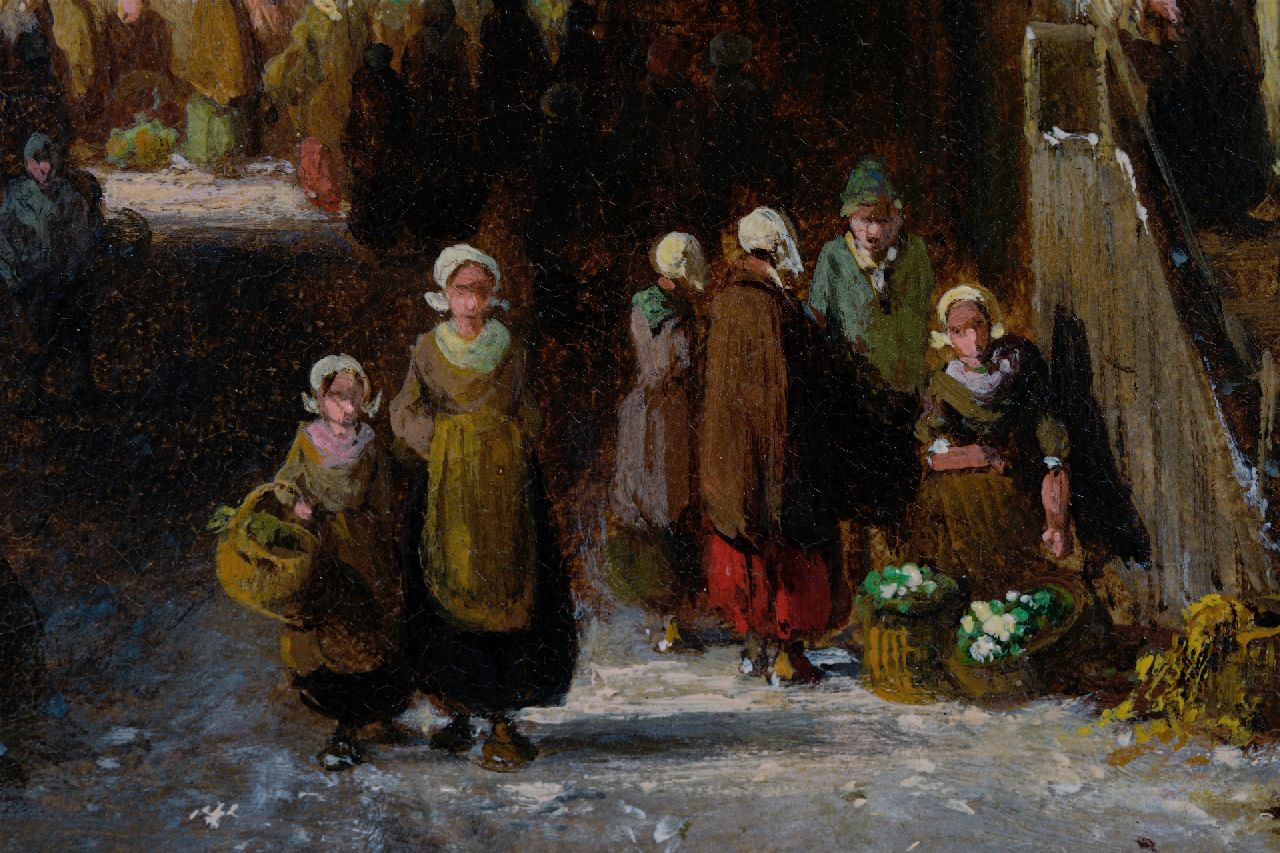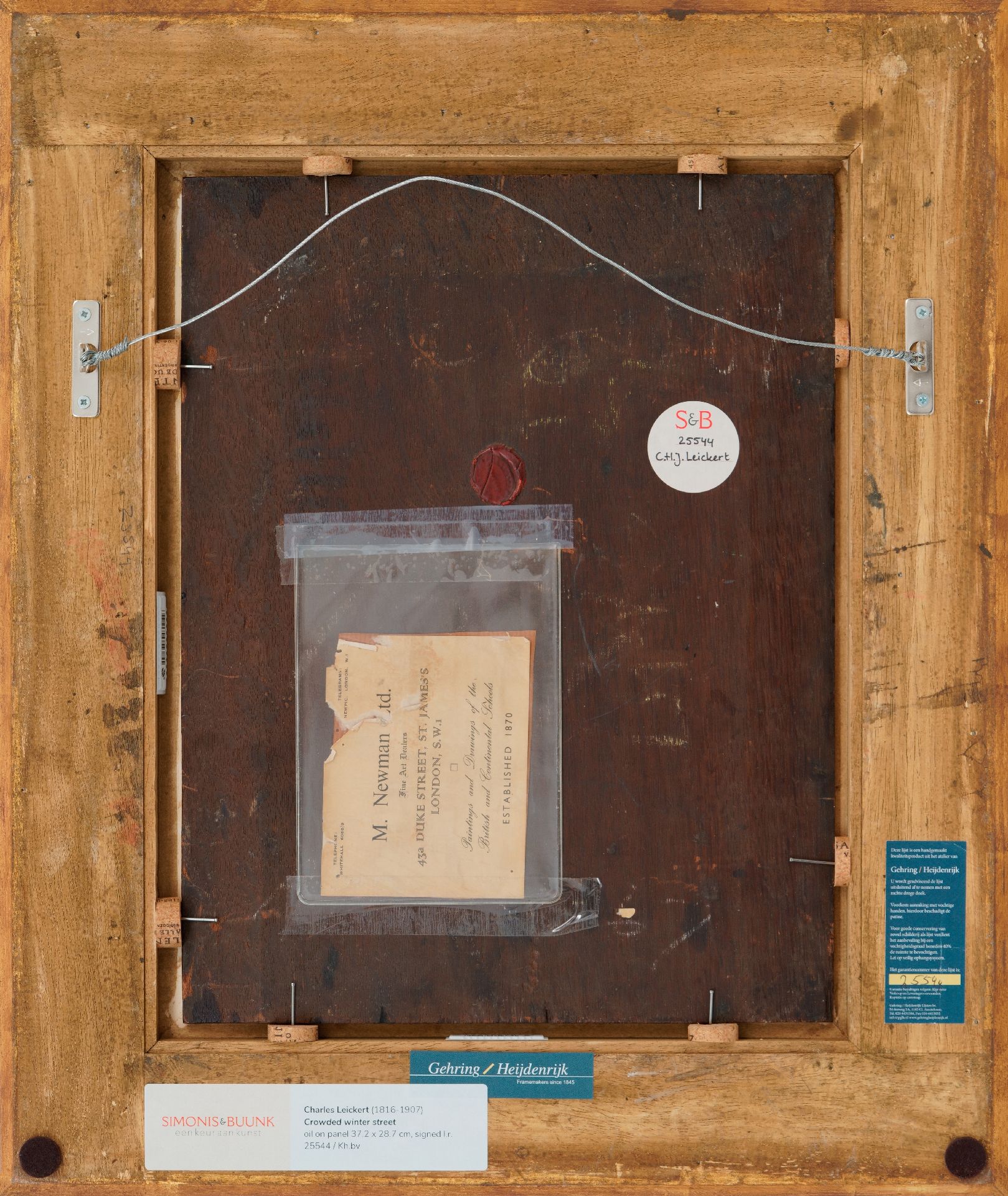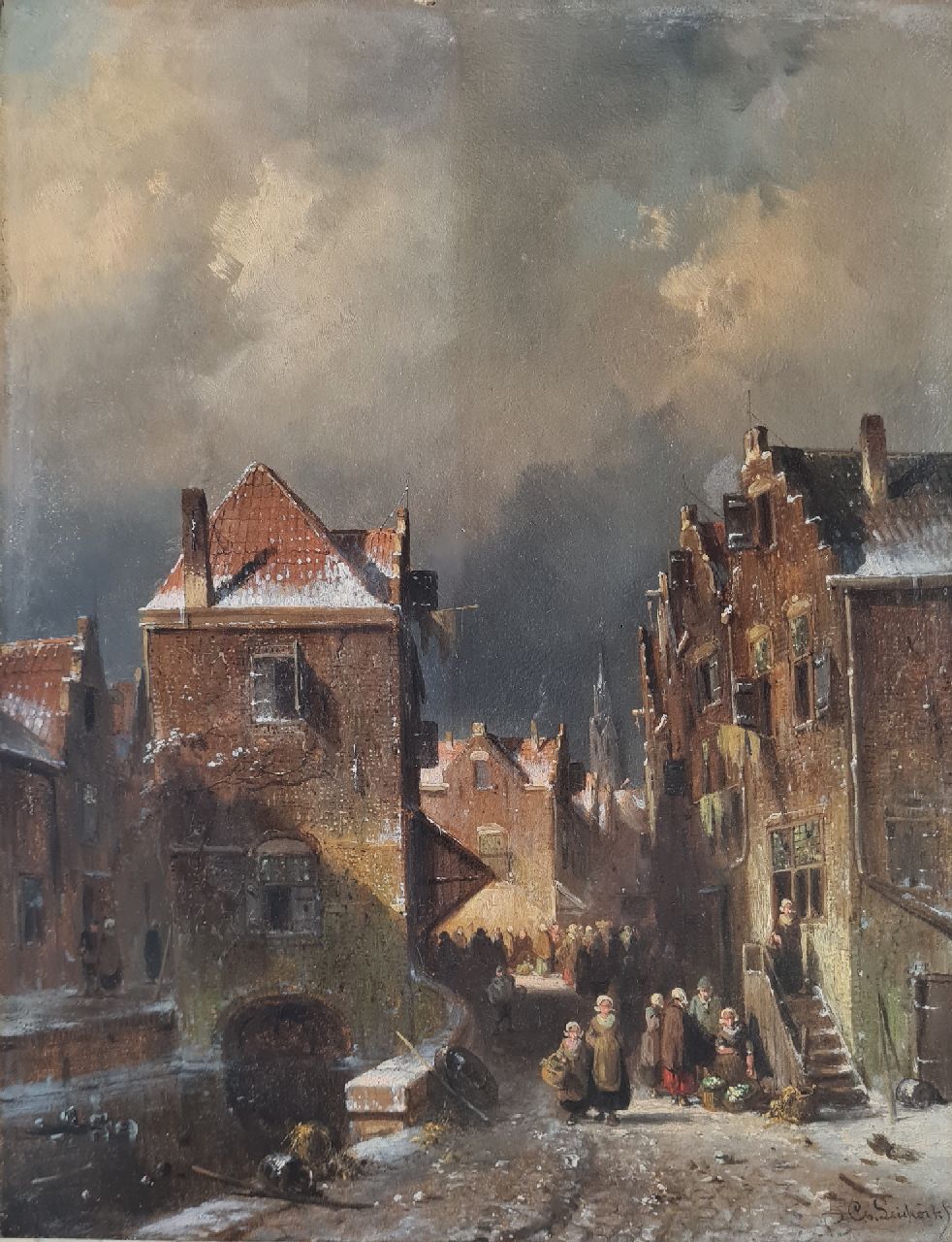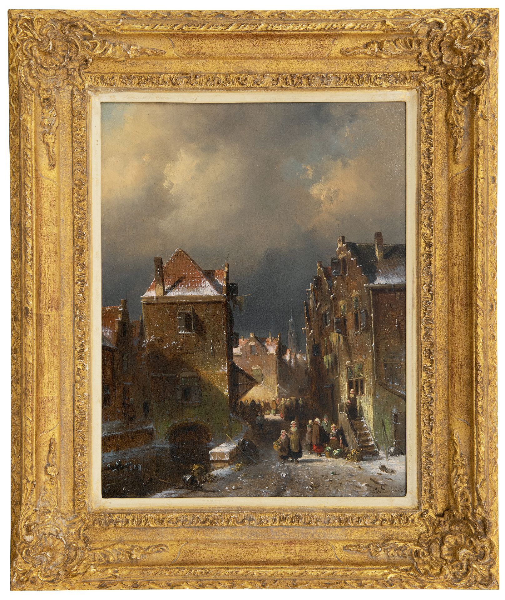 Charles Leickert kunstwerk • schilderij • te koop Drukbevolkt winters straatje