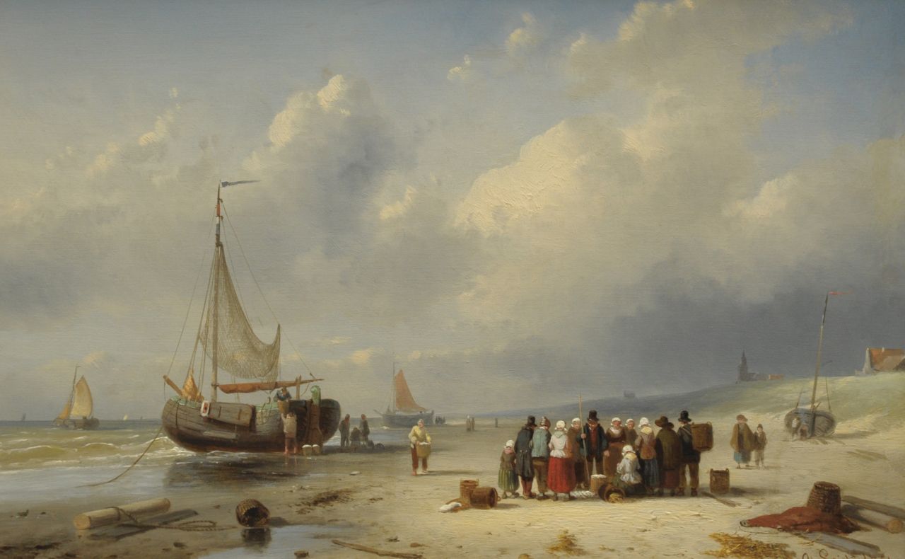 Charles Leickert kunstwerk • schilderij • voorheen te koop Het strand van Scheveningen met pinken en visafslag *)