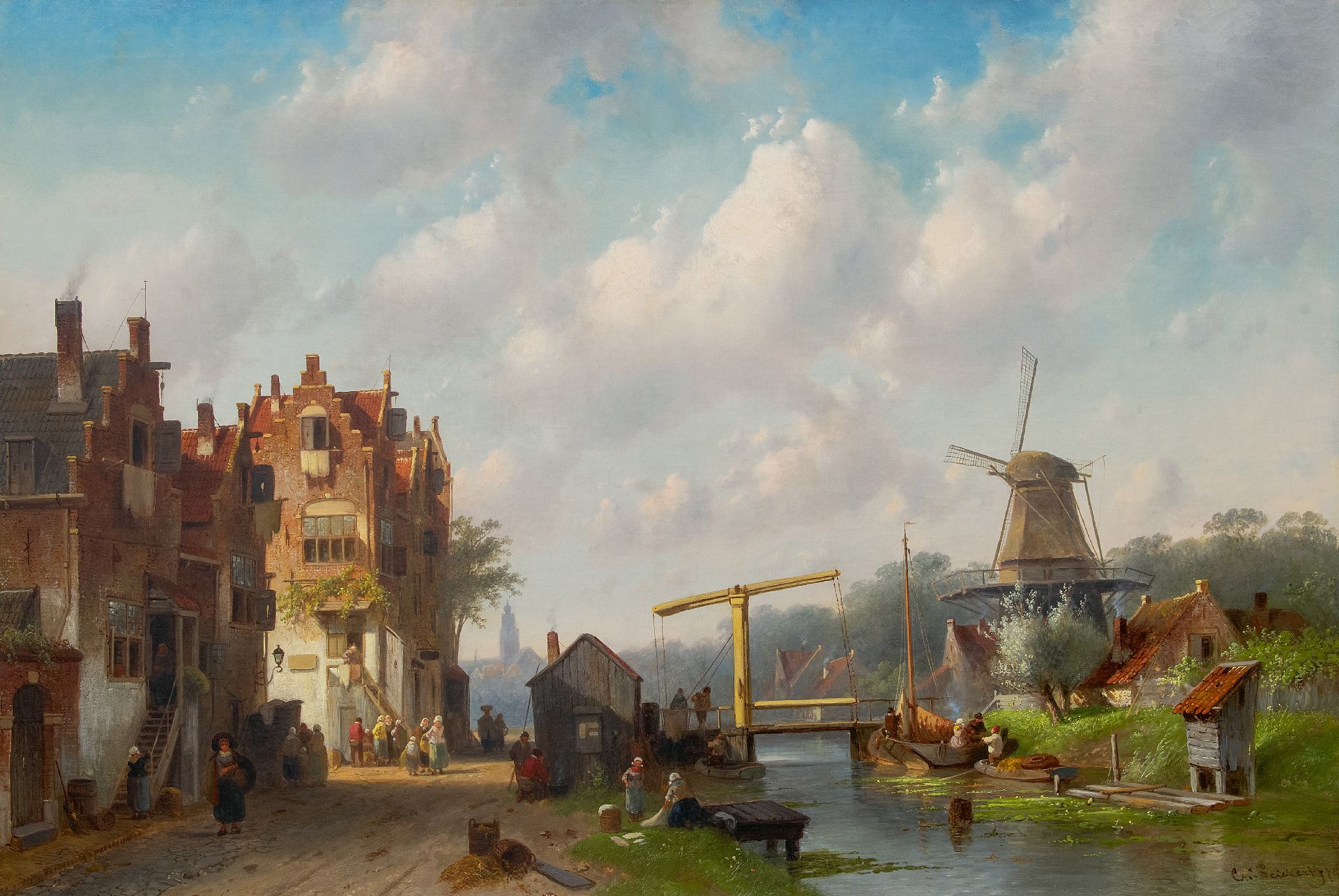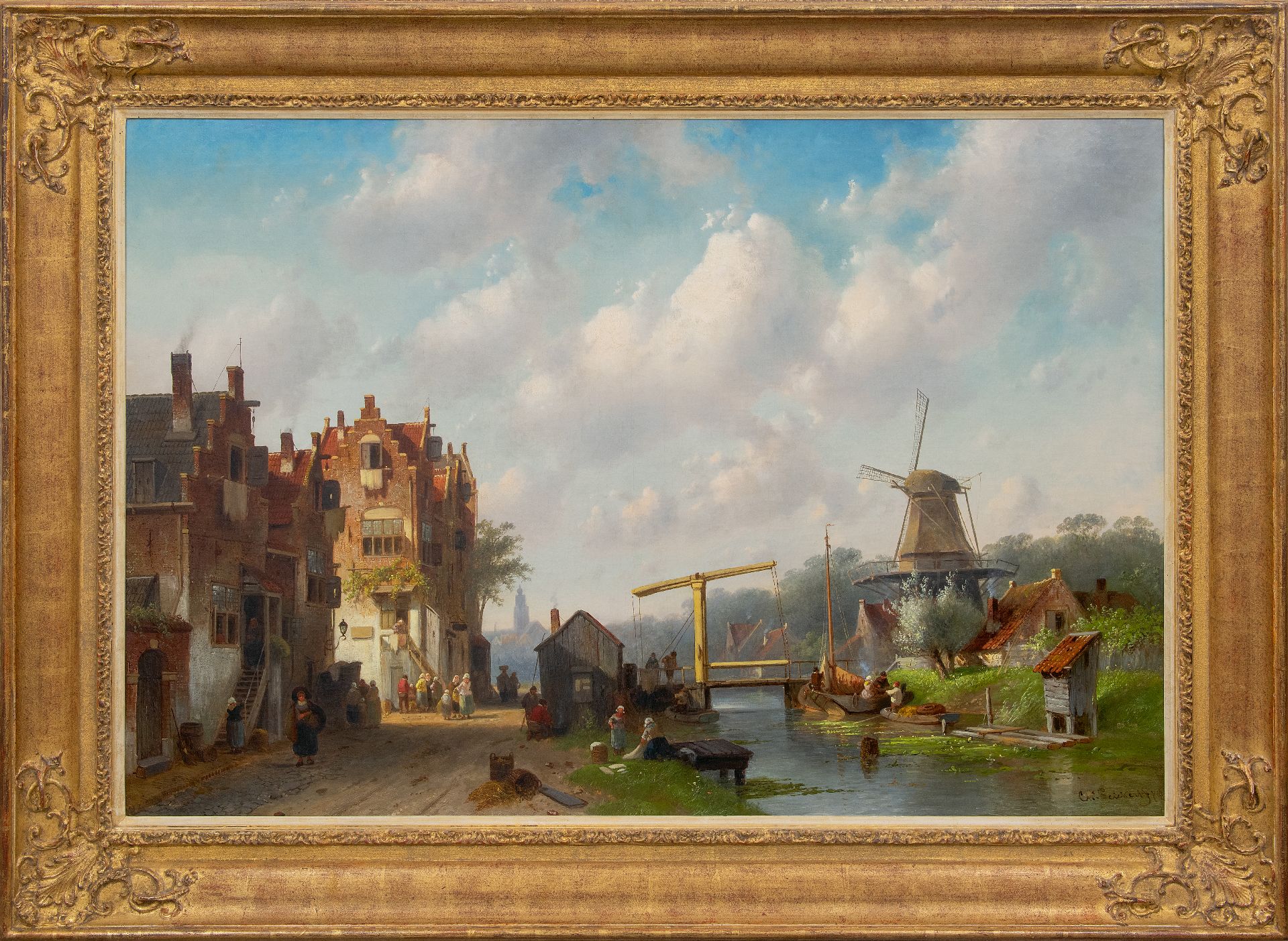 Charles Leickert kunstwerk • schilderij • te koop Hollands dorpsgezicht met ophaalbrug
