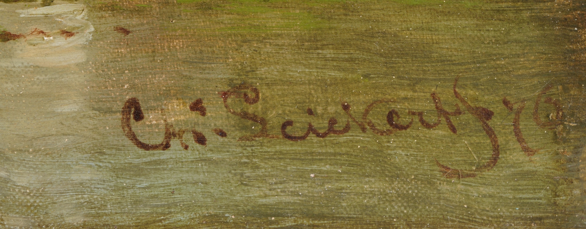 Charles Leickert | Zomers riviergezicht  (uitsluitend met winters pendant tezamen 20.000), olieverf op paneel, 25,0 x 40,0 cm, gesigneerd r.o.