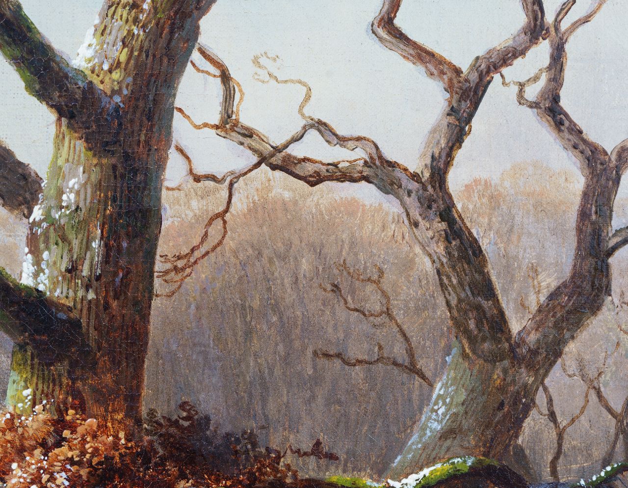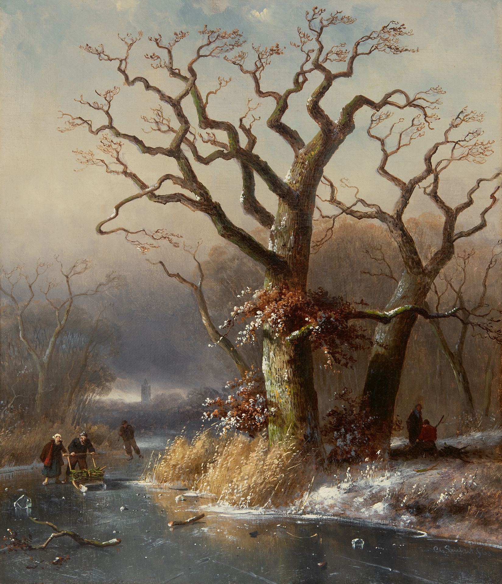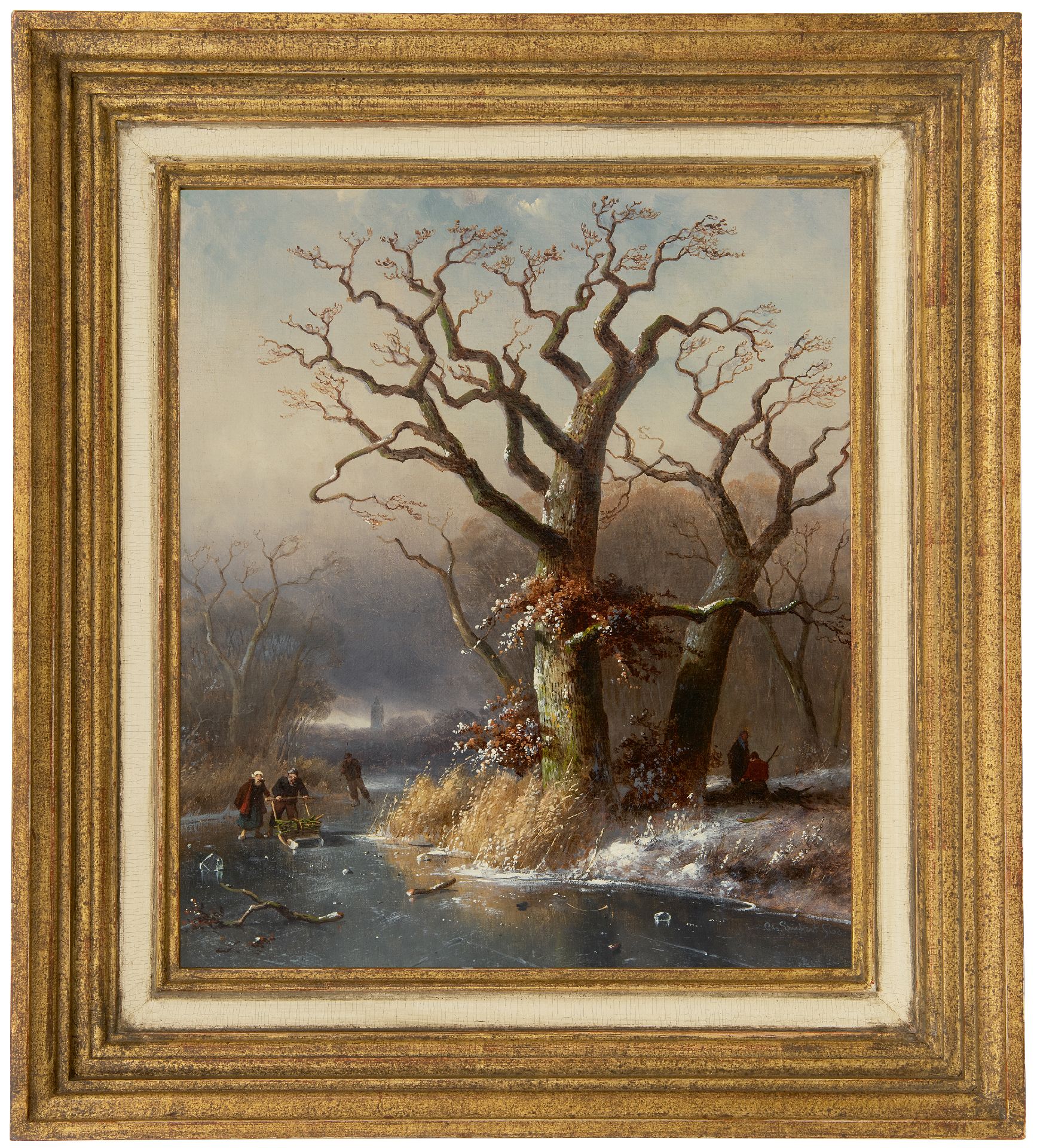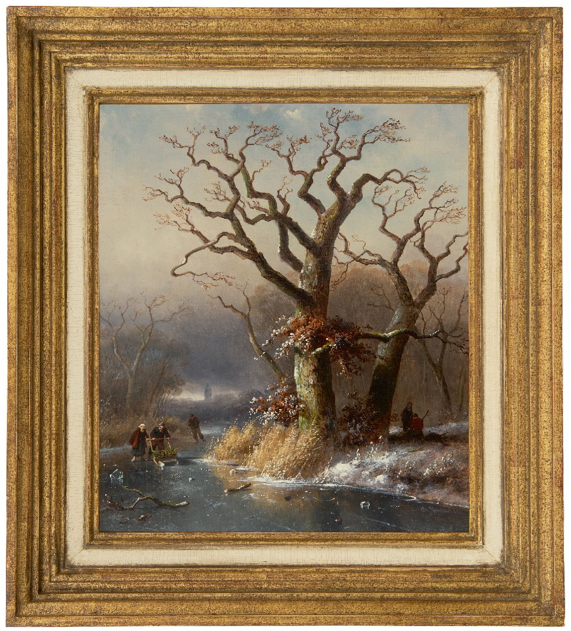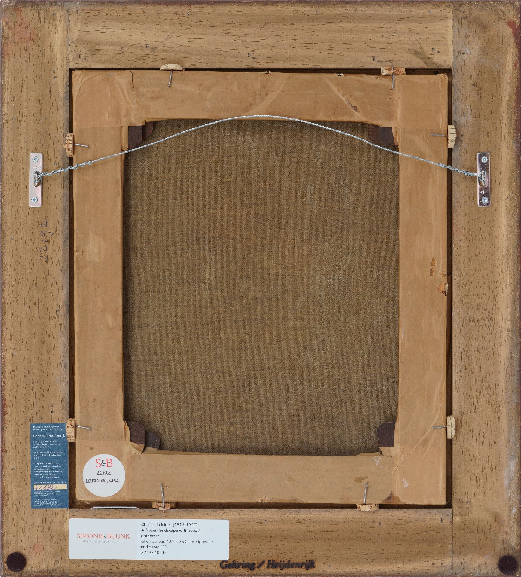 De aantrekkingskracht van de schilderijen van Charles Leickert wordt vooral bepaald door de lichtval en sterk verhalende details. Hij was een echte vakman, die op knappe wijze de juiste stemming kon weergeven en daarmee de smaak van het publiek goed aanvoelde. Zijn wintergezichten zijn echt koud, zijn zomers zonnig en groen. Leickert begint zijn opleiding aan de Haagsche Teekenacademie en werkt tegelijkertijd in het atelier bij Bart van Hove, schilder van stadsgezichten en toneeldecors. Na afronding van de Teekenacademie vervolgt Leickert zijn studie in het atelier van Wijnand Nuijen. Na diens overlijden – hij werd slechts 26 jaar – zet Leickert zijn atelierstudie voort bij Andreas Schelfhout, waar hij zich meer en meer toelegt op het schilderen van landschappen, in het bijzonder winters. In 1850 vertrekt Leickert naar Amsterdam en vanaf die tijd worden zijn onderwerpen steeds gevarieerder. Waren de torens van Dordrecht, Woudrichem en Schiebroek, onder invloed van Nuijen, een vaak voorkomend motief in zijn vroegere werk, nu schildert hij vaak aan de waterkant, langs het strand en de rivieren – op plekken met veel bedrijvigheid. Er is volop plek voor het uitbeelden van de schoonheid van de natuur; een gelaagde lucht, die een naderende sneeuwbui lijkt aan te kondigen en een blauwgrijs bevroren rivier met een prachtige lichtinval halverwege de horizon. Leickerts ‘heimwee’ schilderijen boden houvast aan mensen die moeite hadden met de snel veranderende samenleving. Eigentijdse motieven als treinen en stoomschepen, zoals Schelfhout ze gebruikte, komen in zijn schilderijen niet voor. Liever legde hij een tijdloos landschap vast dat een weergave is van de schoonheid van de natuur.