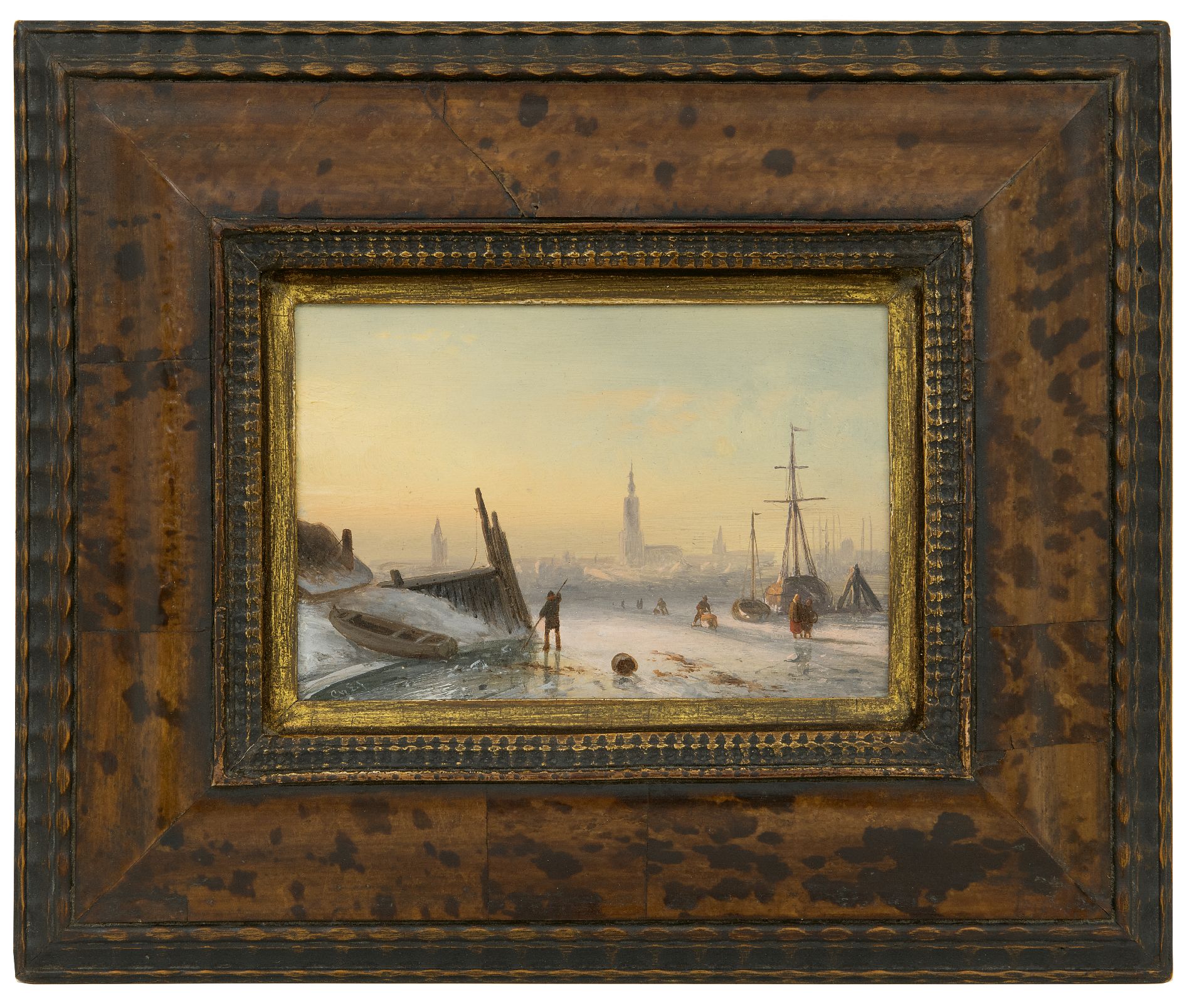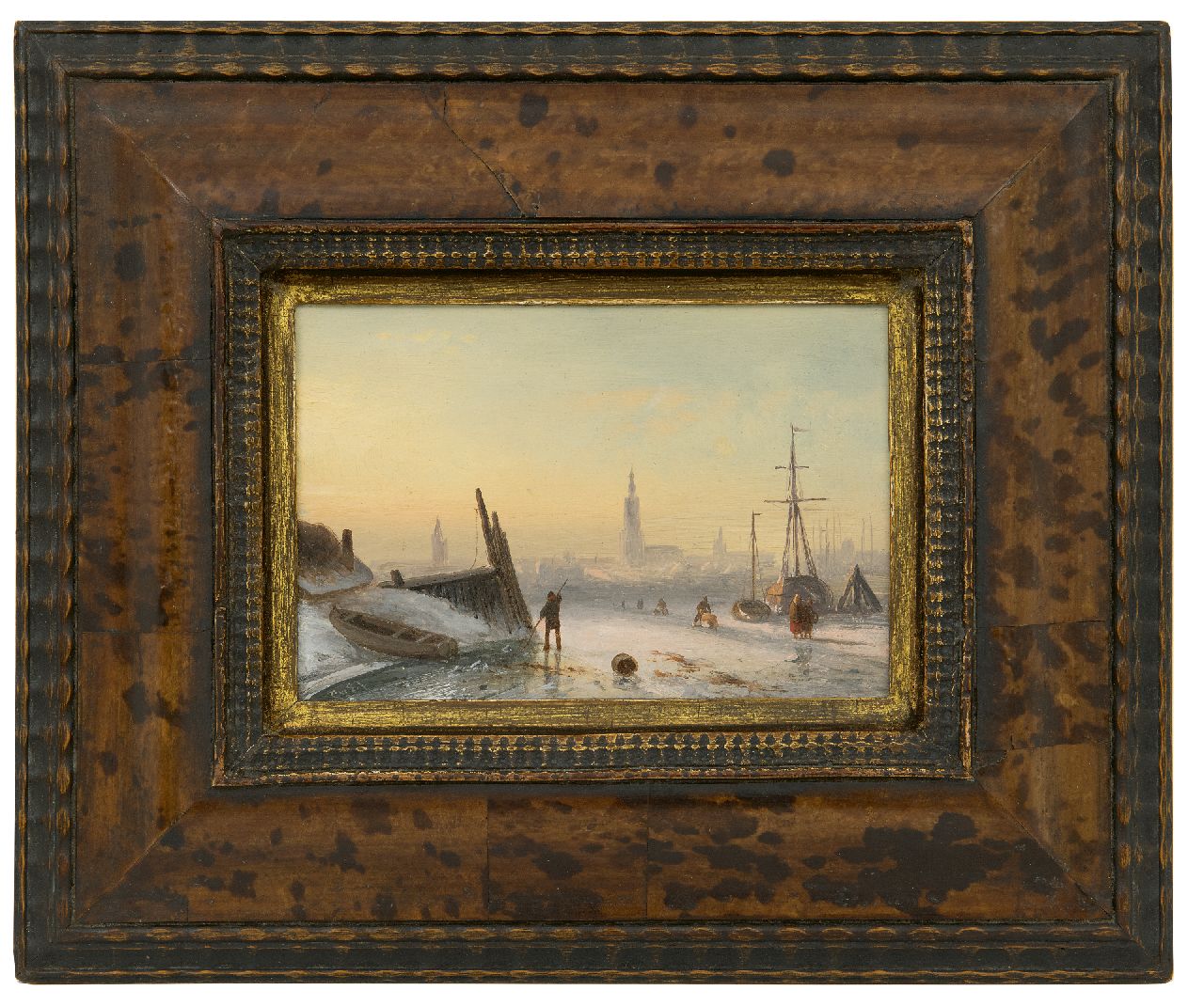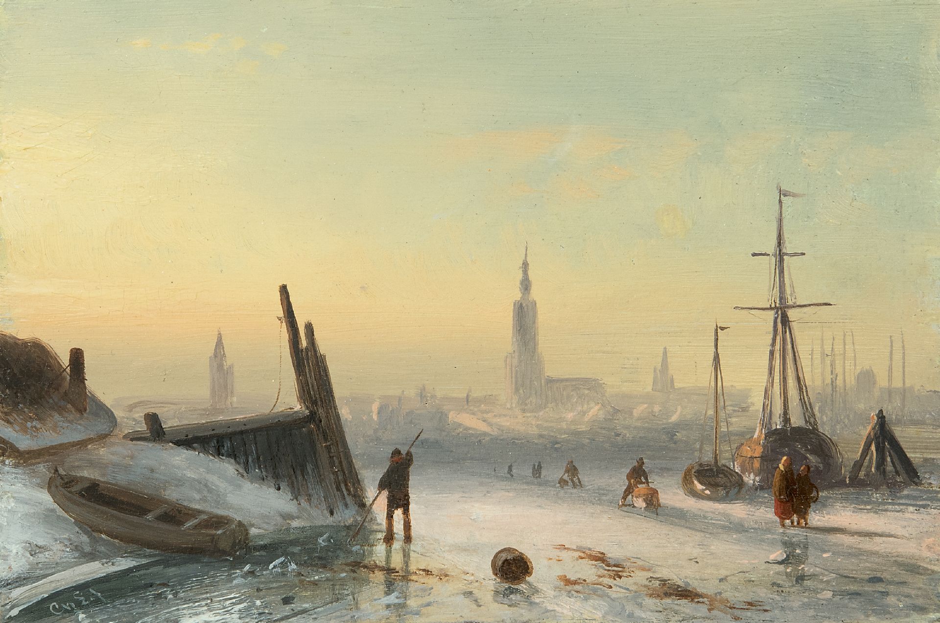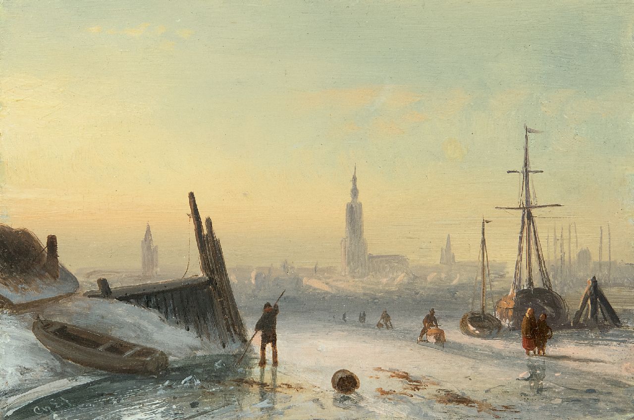 Charles Leickert kunstwerk • schilderij • voorheen te koop IJsgezicht met schaatsers bij een stad
