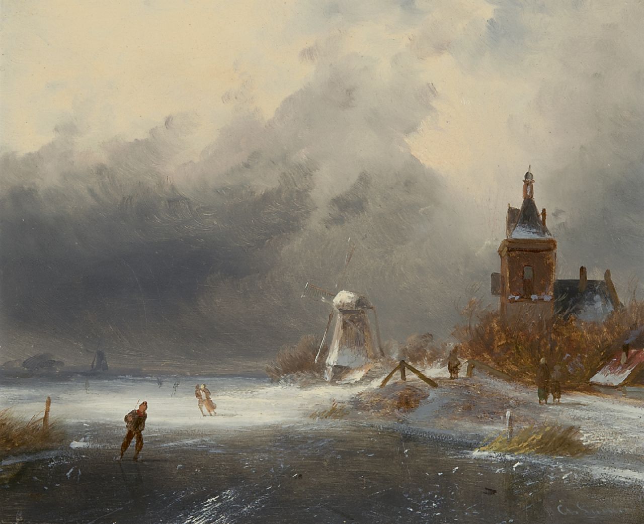 Charles Leickert kunstwerk • schilderij • voorheen te koop IJsgezicht met schaatsers en wandelaars
