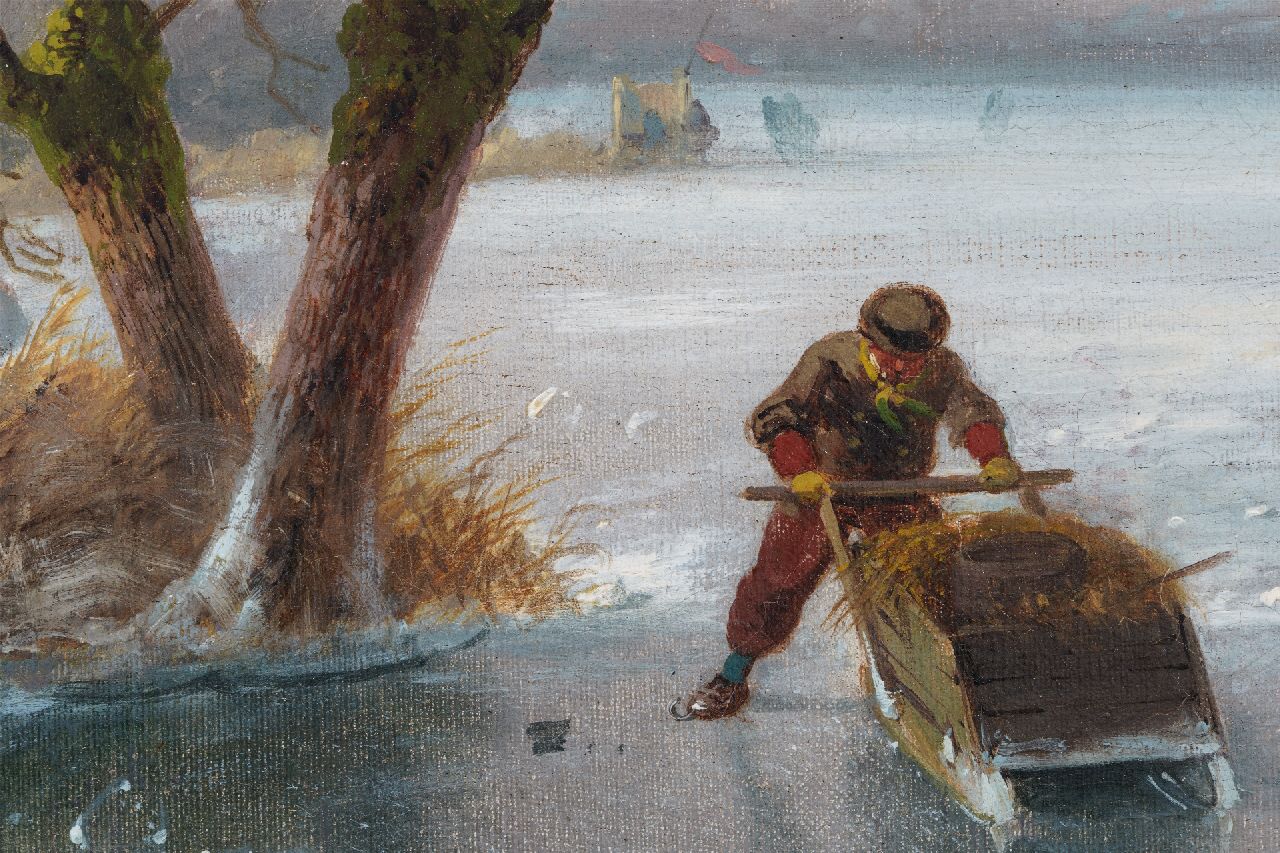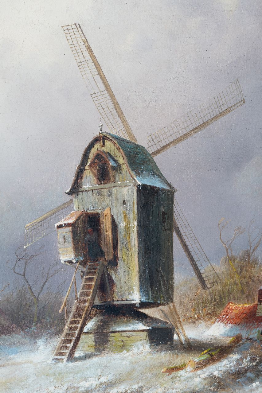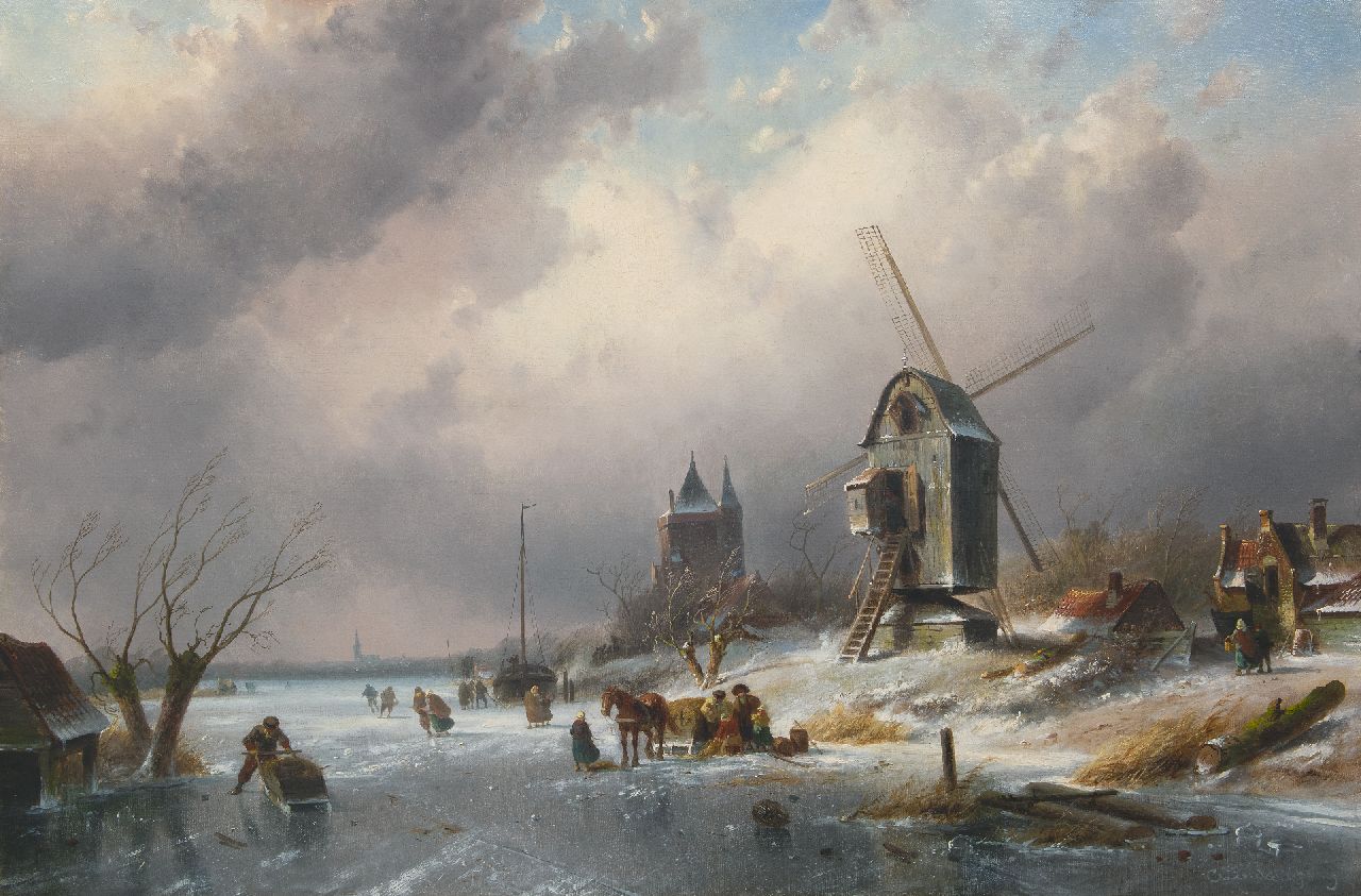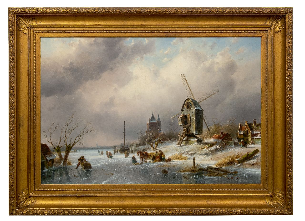 Charles Leickert kunstwerk • schilderij • voorheen te koop IJsgezicht met schaatsers, paardenslee en molen