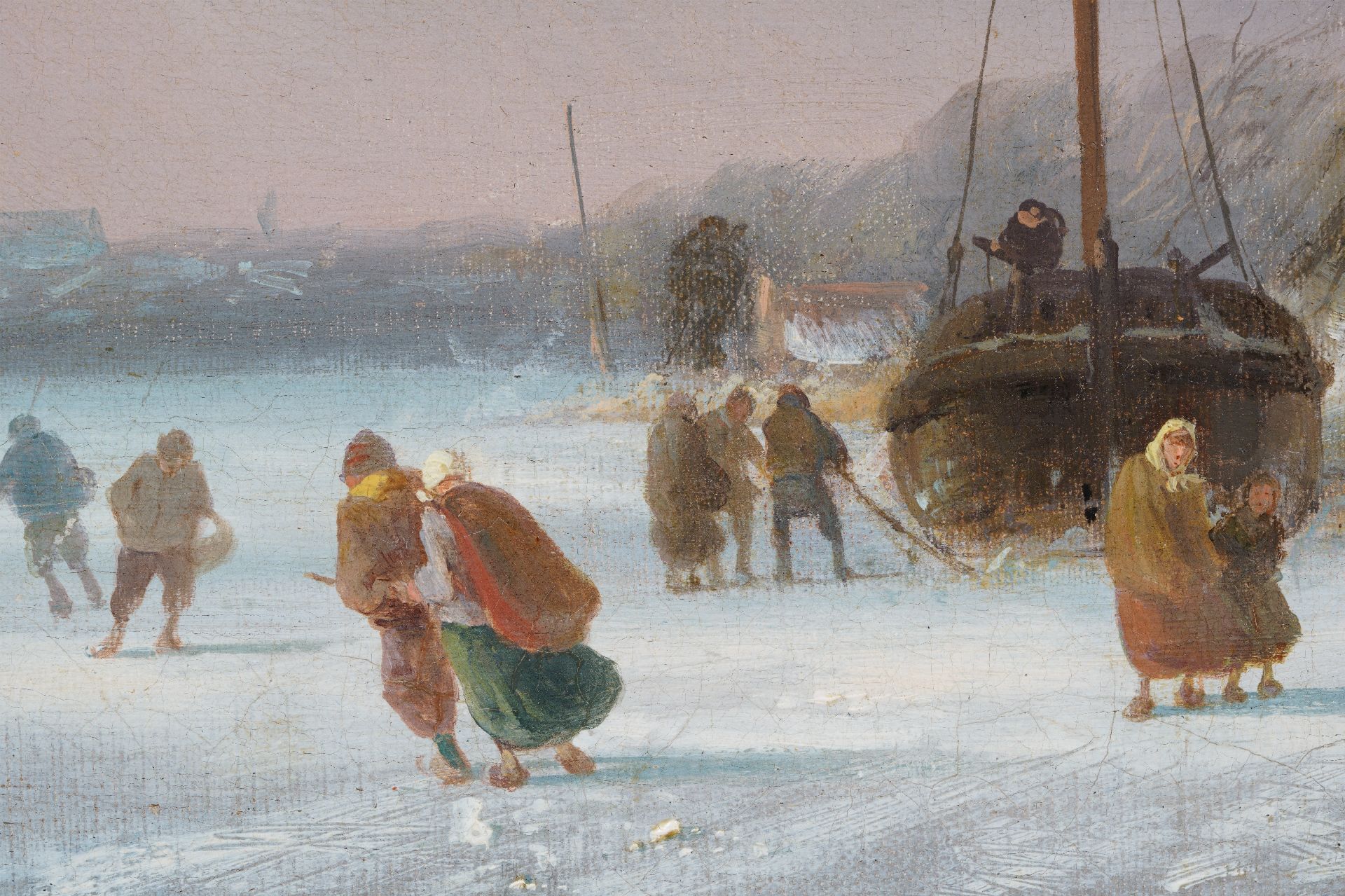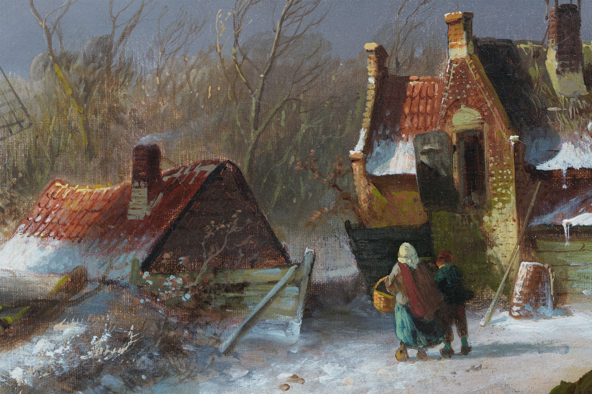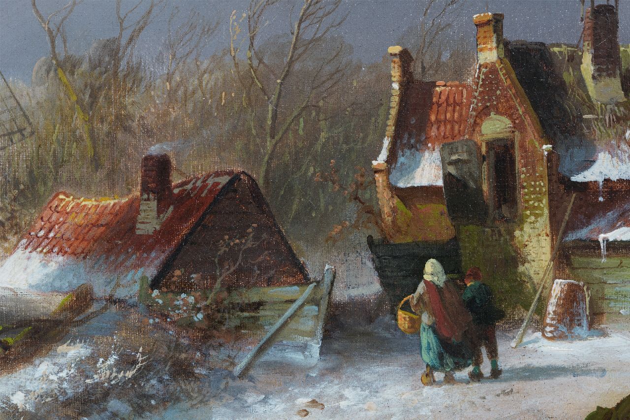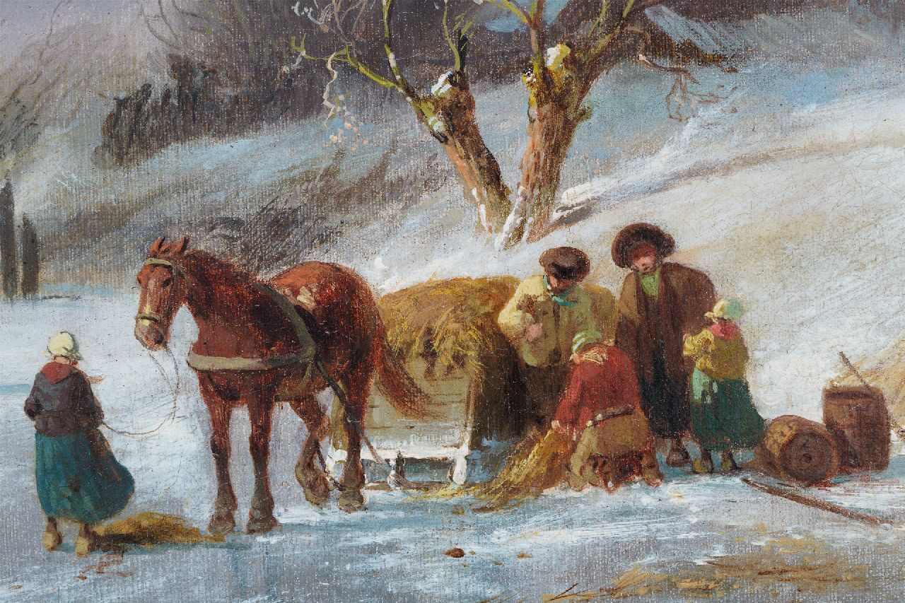 Charles Leickert kunstwerk • schilderij • voorheen te koop IJsgezicht met schaatsers, paardenslee en molen