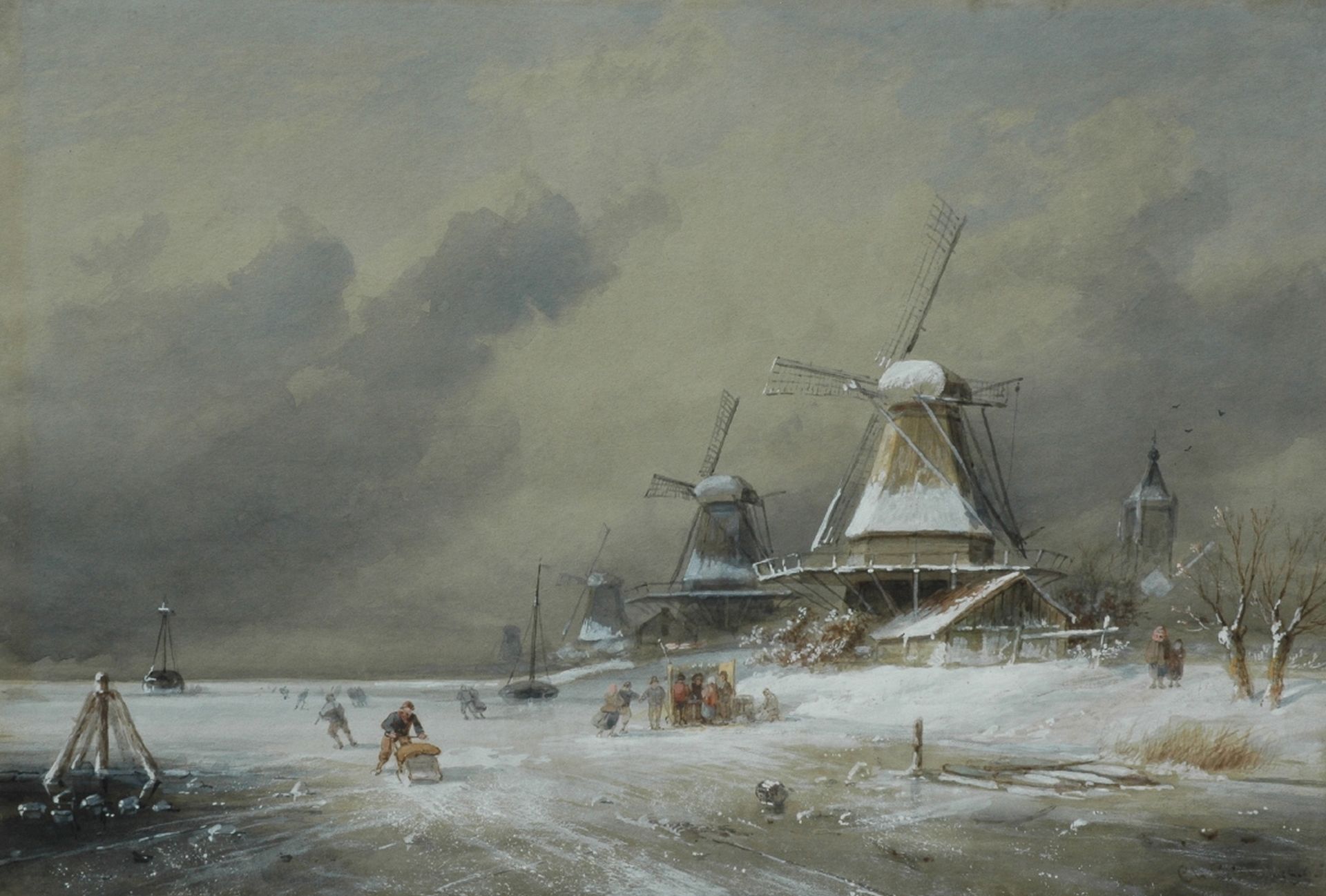 Charles Leickert kunstwerk • aquarel • tekening • voorheen te koop IJsvertier bij molens