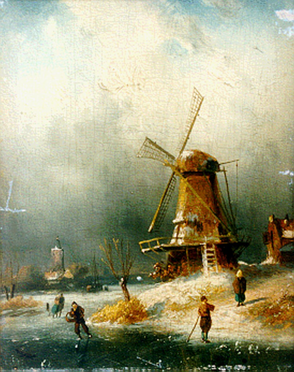 Charles Leickert kunstwerk • schilderij • voorheen te koop Schaatsers bij een molen