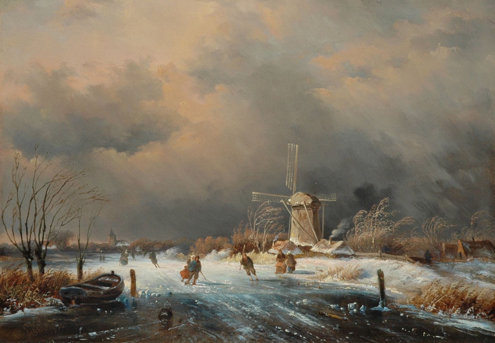 Charles Leickert kunstwerk • schilderij • voorheen te koop Schaatsers bij naderende sneeuwstorm