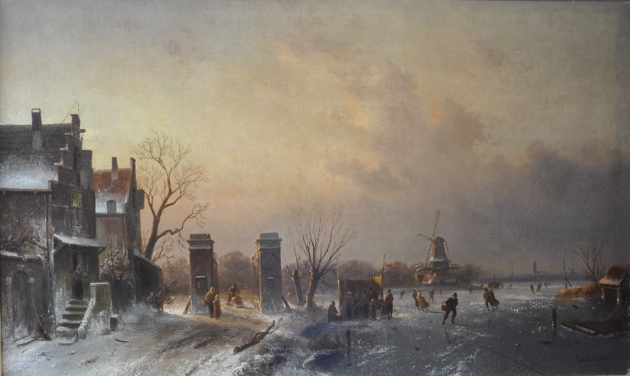 Charles Leickert kunstwerk • schilderij • voorheen te koop Schaatsers en koek-en-zopie bij een tolhek