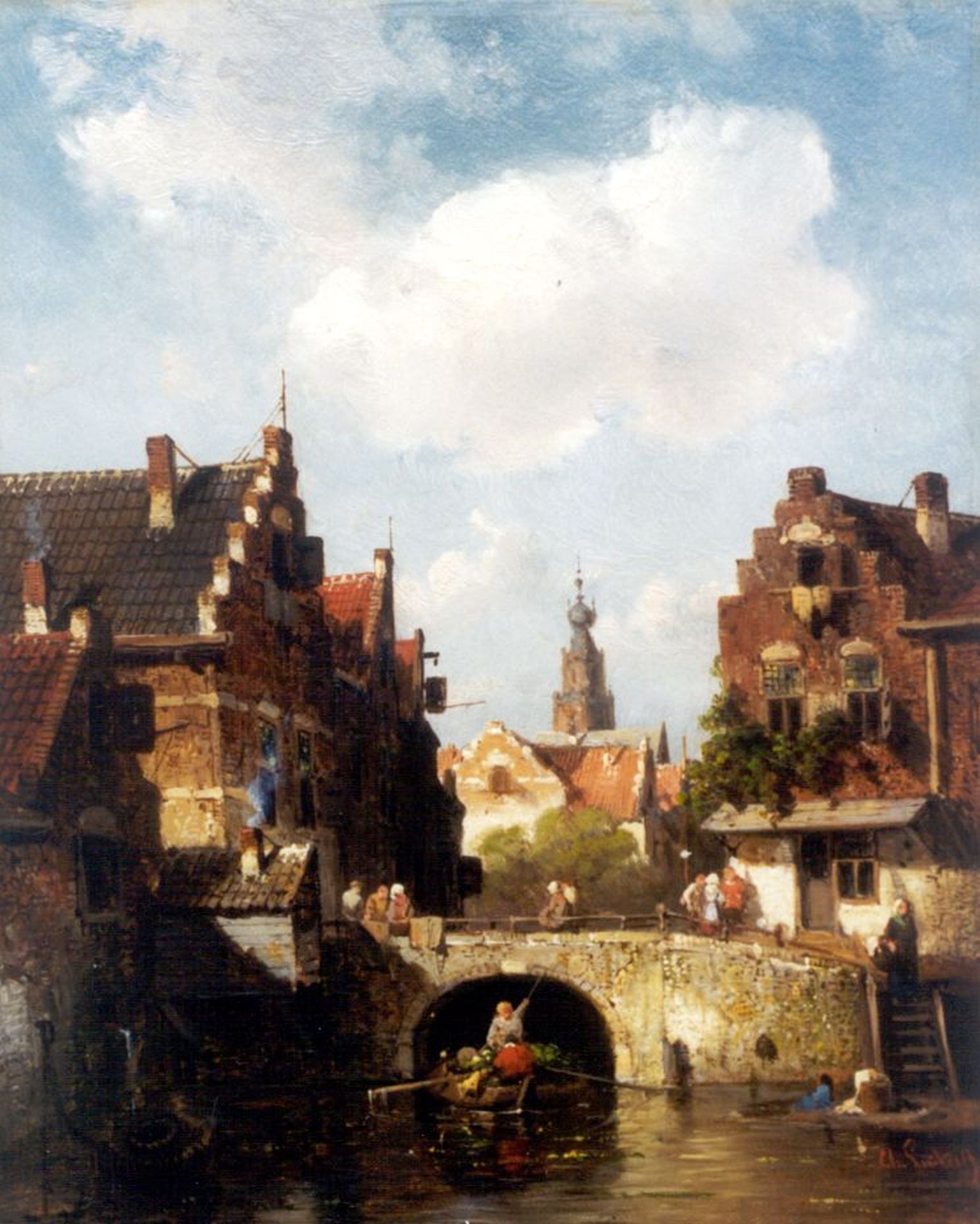 Charles Leickert kunstwerk • schilderij • voorheen te koop Stadsgezicht met een groentenschuit op een gracht