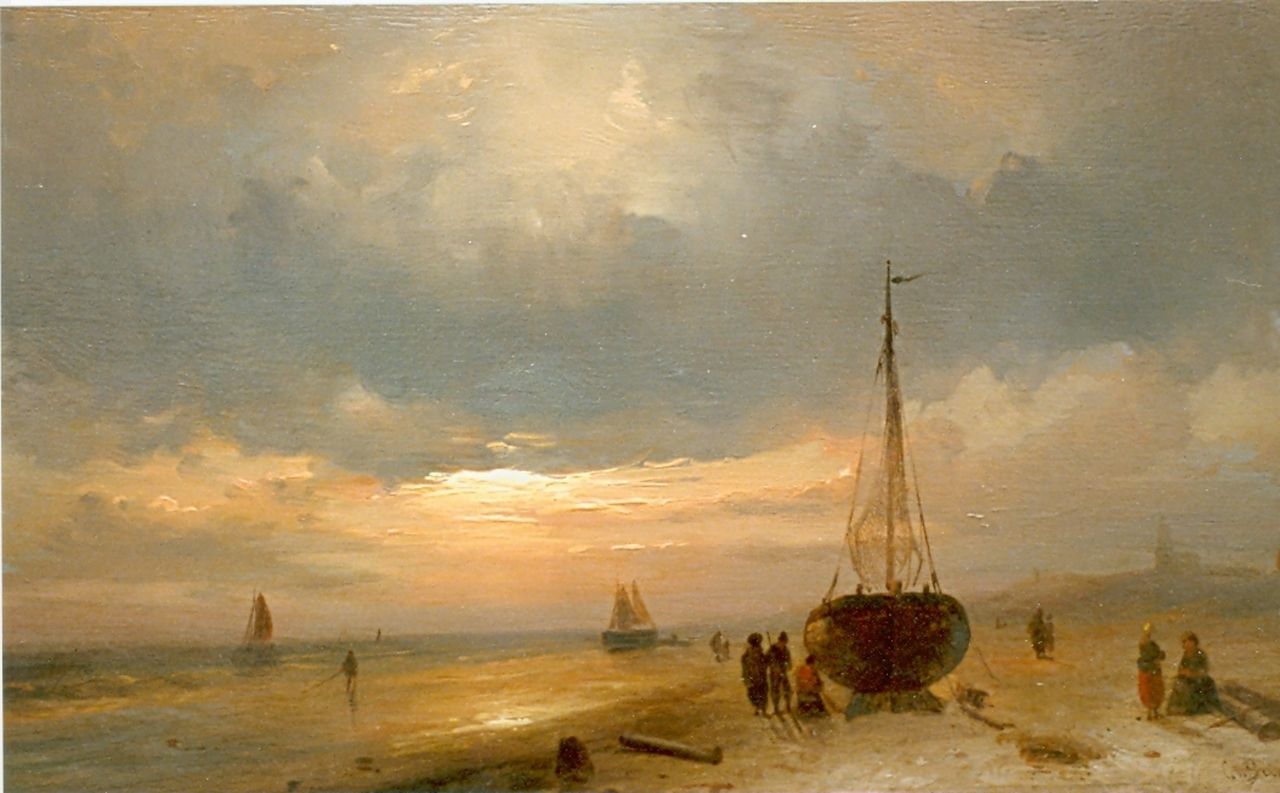 Charles Leickert kunstwerk • schilderij • voorheen te koop Strandgezicht bij ondergaande zon