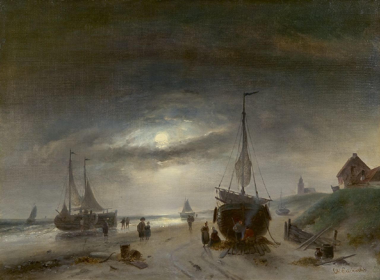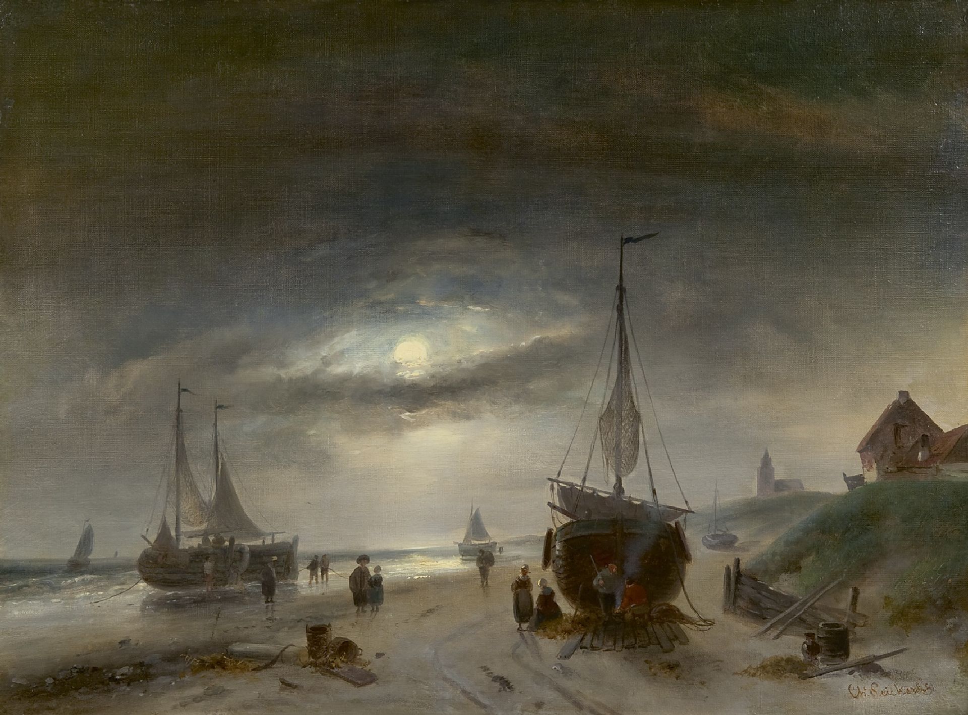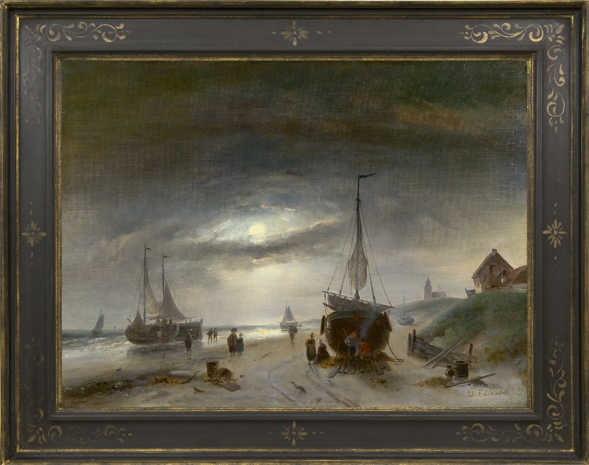Charles Leickert kunstwerk • schilderij • voorheen te koop Vissers en schepen op het strand van Scheveningen, bij maanlicht
