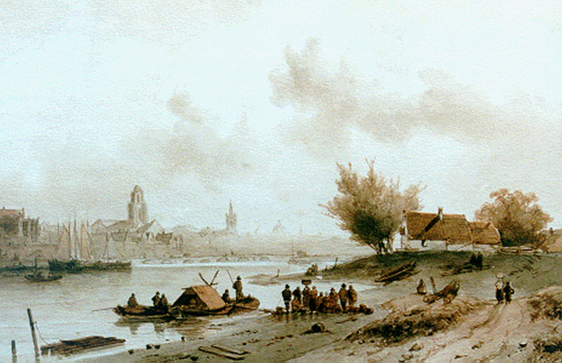 Charles Leickert kunstwerk • aquarel • tekening • voorheen te koop Vissersvolk bij de rivier