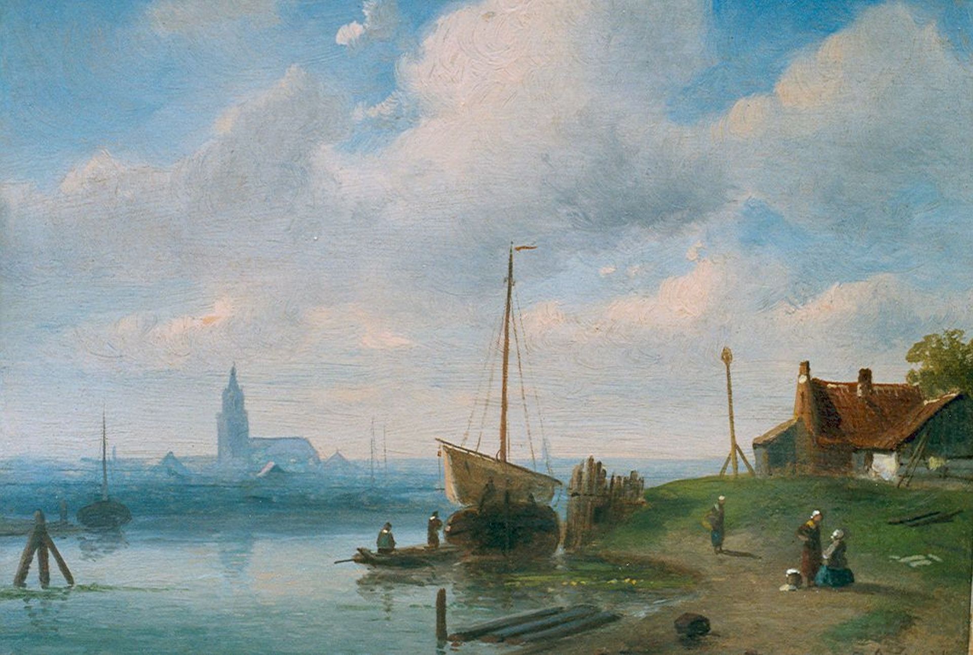 Charles Leickert kunstwerk • schilderij • voorheen te koop Wasvrouwen en afgemeerd schip aan een rivieroever
