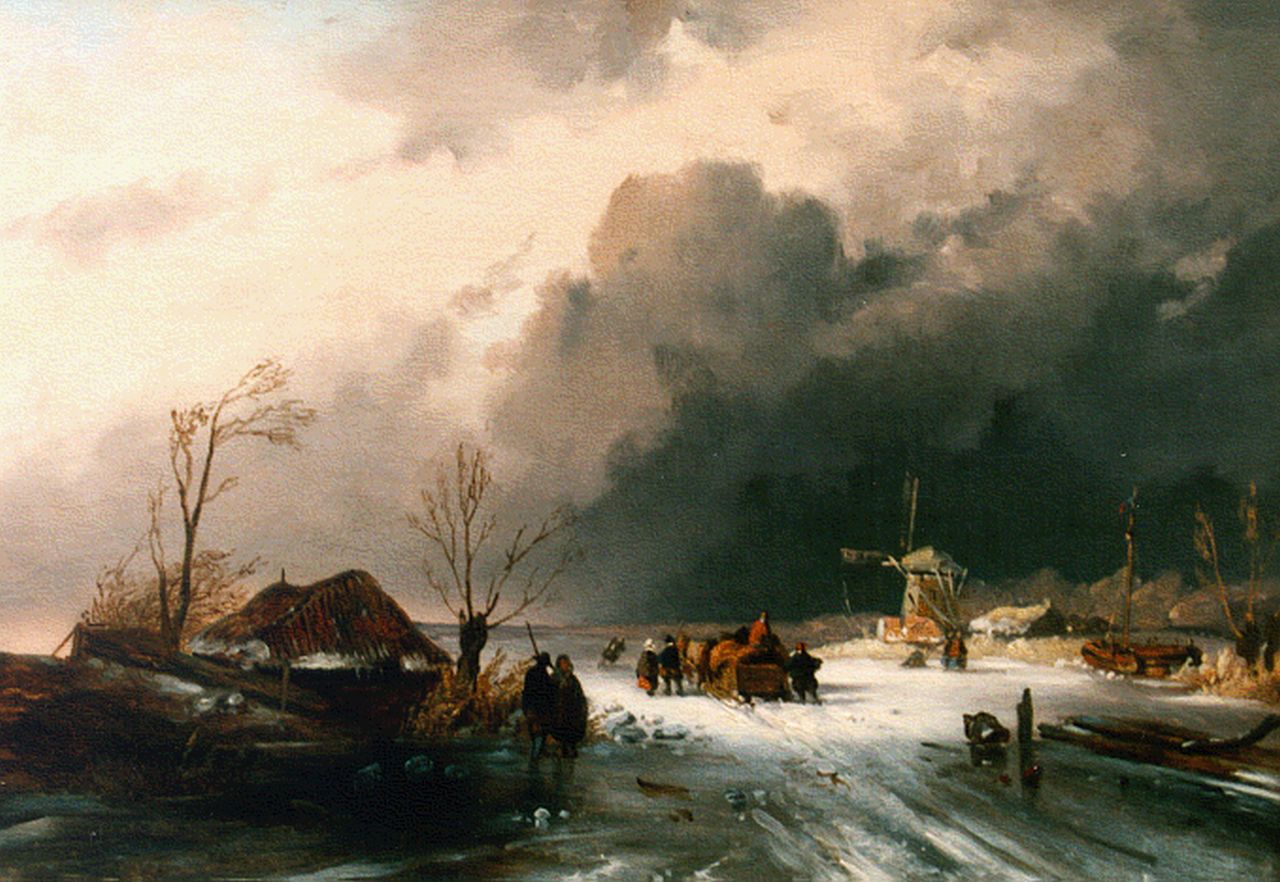 Charles Leickert kunstwerk • schilderij • voorheen te koop Wintergezicht met schaatsers en slede op het ijs